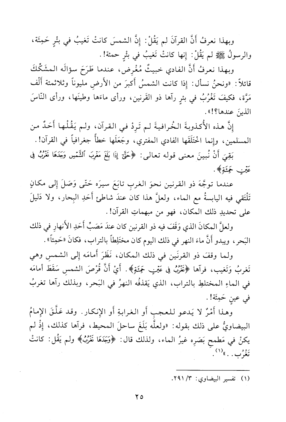 قائلاً: " ونحنُ نسأل: إِذا كانت الشمسُ أَكبرَ من الأَرضِ مليوناً وثلاثمئة أَلْف مَرَّة، فكيفَ تَغْرُبُ في بئرٍ رآها ذو القَرنين، ورأى ماءَها وطينَها، ورأى النّاسَ الذينَ عندها؟