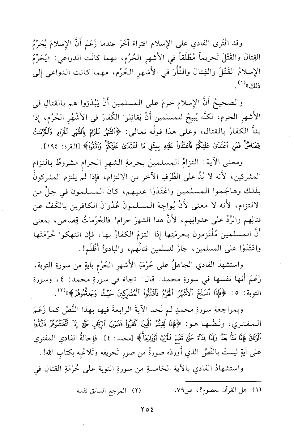 واستشهادُ الفادي بالآيةِ الخامسةِ من سورةِ التوبة على حُرْمَةِ القتال في