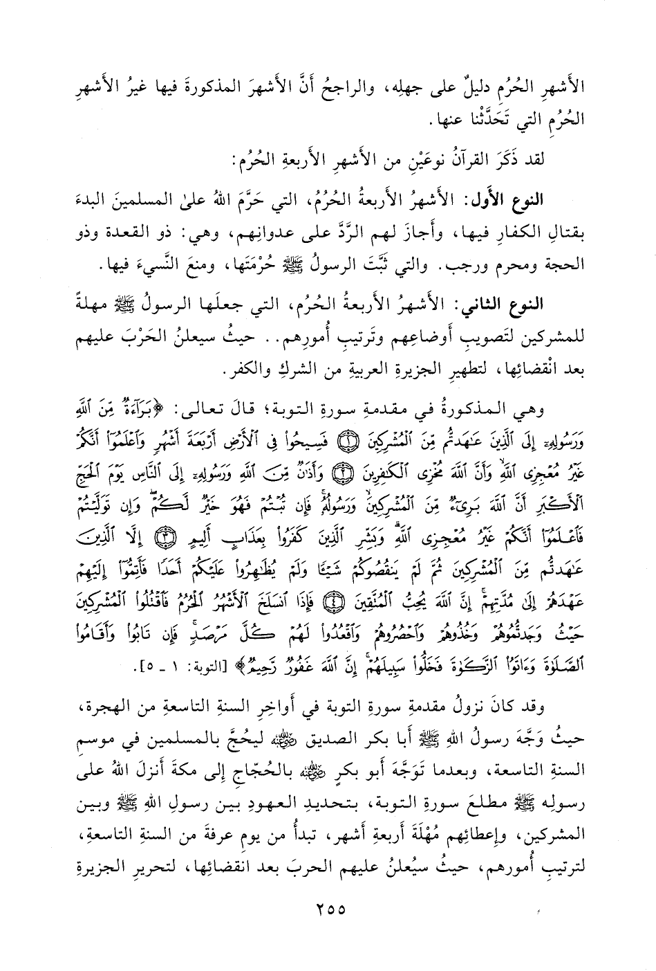 بَرَاءَةٌ مِنَ اللَّهِ وَرَسُولِهِ إِلَى الَّذِينَ عَاهَدْتُمْ مِنَ الْمُشْرِكِينَ (1) فَسِيحُوا فِي الْأَرْضِ أَرْبَعَةَ أَشْهُرٍ وَاعْلَمُوا أَنَّكُمْ غَيْرُ مُعْجِزِي اللَّهِ وَأَنَّ اللَّهَ مُخْزِي الْكَافِرِينَ (2) وَأَذَانٌ مِنَ اللَّهِ وَرَسُولِهِ إِلَى النَّاسِ يَوْمَ الْحَجِّ الْأَكْبَرِ أَنَّ اللَّهَ بَرِيءٌ مِنَ الْمُشْرِكِينَ وَرَسُولُهُ فَإِنْ تُبْتُمْ فَهُوَ خَيْرٌ لَكُمْ وَإِنْ تَوَلَّيْتُمْ فَاعْلَمُوا أَنَّكُمْ غَيْرُ مُعْجِزِي اللَّهِ وَبَشِّرِ الَّذِينَ كَفَرُوا بِعَذَابٍ أَلِيمٍ (3) إِلَّا الَّذِينَ عَاهَدْتُمْ مِنَ الْمُشْرِكِينَ ثُمَّ لَمْ يَنْقُصُوكُمْ شَيْئًا وَلَمْ يُظَاهِرُوا عَلَيْكُمْ أَحَدًا فَأَتِمُّوا إِلَيْهِمْ عَهْدَهُمْ إِلَى مُدَّتِهِمْ إِنَّ اللَّهَ يُحِبُّ الْمُتَّقِينَ (4) فَإِذَا انْسَلَخَ الْأَشْهُرُ الْحُرُمُ فَاقْتُلُوا الْمُشْرِكِينَ حَيْثُ وَجَدْتُمُوهُمْ وَخُذُوهُمْ وَاحْصُرُوهُمْ وَاقْعُدُوا لَهُمْ كُلَّ مَرْصَدٍ فَإِنْ تَابُوا وَأَقَامُوا الصَّلَاةَ وَآتَوُا الزَّكَاةَ فَخَلُّوا سَبِيلَهُمْ إِنَّ اللَّهَ غَفُورٌ رَحِيمٌ (5) .