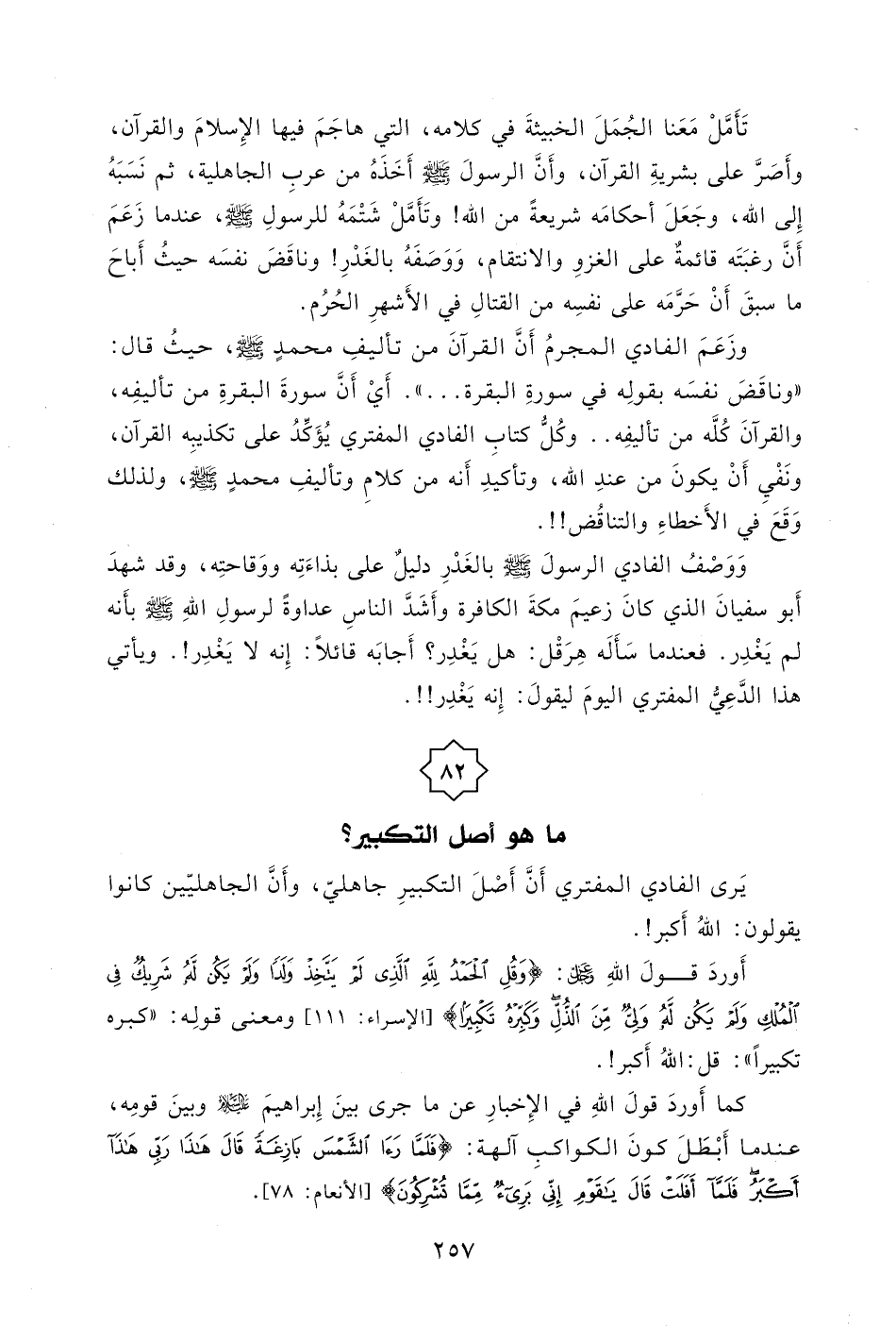 وأَصَرَّ على بشريةِ القرآن، وأَنَّ الرسولَ - صلى الله عليه وسلم - أَخَذَهُ من عربِ الجاهلية، ثم نَسَبَهُ إِلى الله، وجَعَلَ أحكامَه شريعةً من الله! وتَأَمَّلْ شَتْمَهُ للرسولِ - صلى الله عليه وسلم -، عندما زَعَمَ أَنَّ رغبَتَه قائمةٌ على الغزوِ والانتقام، وَوَصَفَهُ بالغَدْرِ! وناقَضَ نفسَه حيثُ أَباحَ ما سبقَ أَنْ حَرَّمَه على نفسِه من القتالِ في الأَشهرِ الحُرُم.