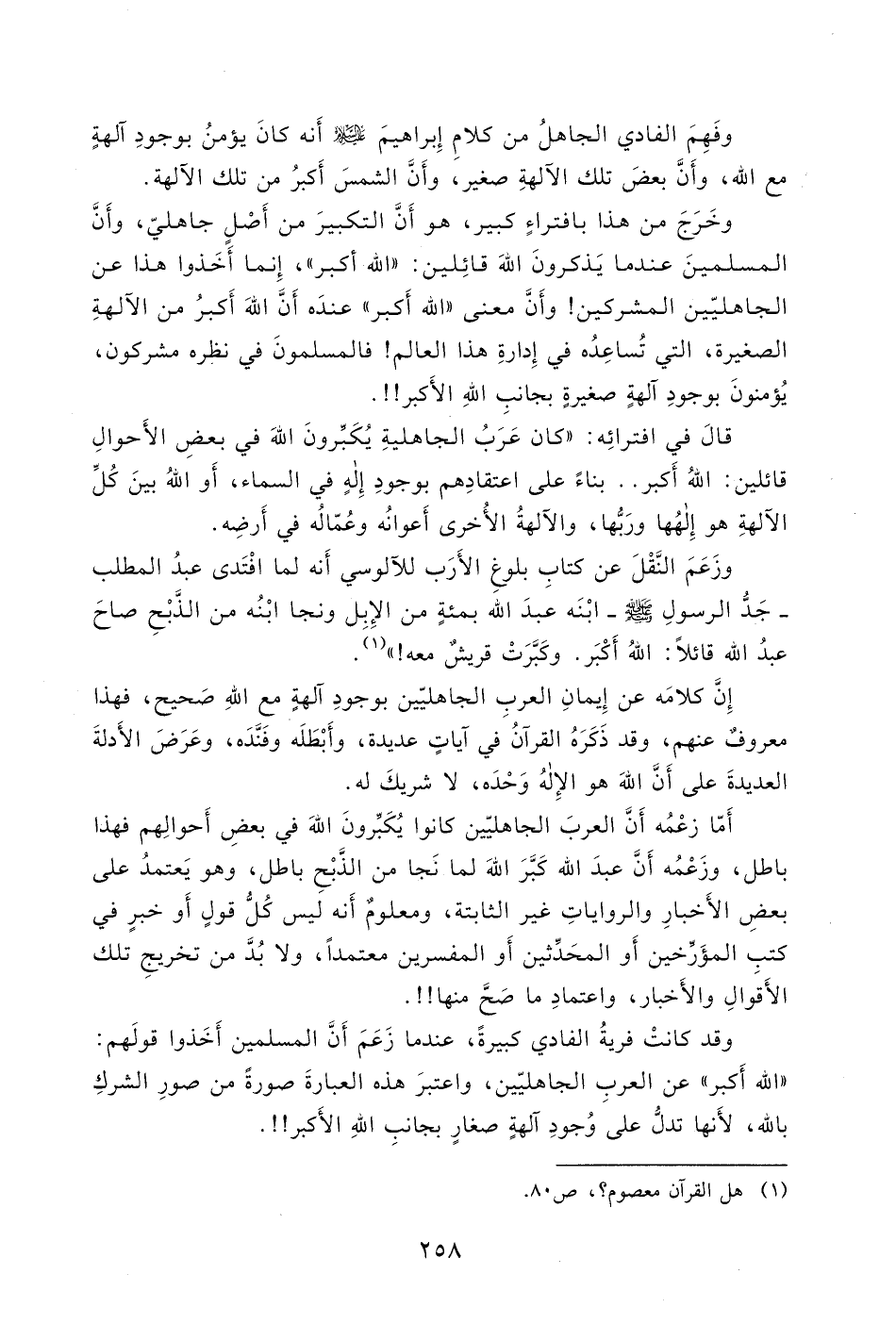 " الله أَكبر " عن العربِ الجاهليّين، واعتبرَ هذه العبارةَ صورةً من صورِ الشركِ بالله، لأَنها تدل على وُجودِ آلهةٍ صغارٍ بجانبِ اللهِ الأَكبر!!.
