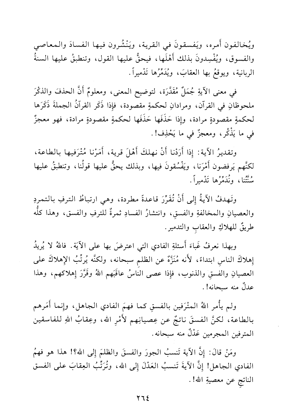 فاللهُ لا يُريدُ إِهلاكَ الناسِ ابتداءً، لأَنه مُنَزهٌ عن الظلمِ سبحانه، ولكنَّه يُرتِّبُ الإِهلاكَ على العصيانِ والفسقِ والذنوب، فإِذا عصى الناسُ عاقَبَهم الله وقَرَّرَ إِهلاكهم، وهذا عدلٌ منه سبحانه!.