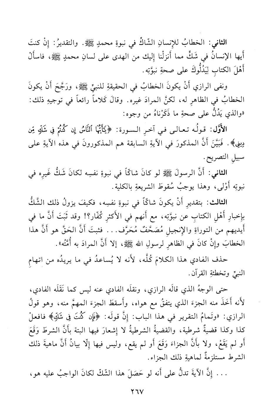 الرازي: " وتَمامُ التقرير في هذا الباب: إِنَّ قولَه: (فإن كنُتَ فِى شَكٍّ) فافعلْ كذا وكذا قضيةٌ شرطية، والقضيهُ الشرطيةُ لا إِشعارَ فيها ألبتة بأَنَّ الشرطَ وَقَعَ أَو لم يَقَعْ، ولا بأَنَّ الجزاءَ وَقَعَ أَو لم يقع، وليس فيها إِلّا بيانُ أَنَّ ماهيةَ ذلك الشرط مستلزمةٌ لماهيةِ ذلك الجزاء ... .