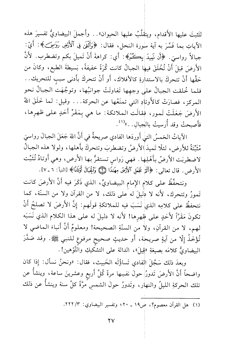 تَمورُ وتتحرك، لأَنه لا دليلَ له على ذلك، لا من القرآن ولا من السنّة، كما نتحفظُ على كلامِه الذي نَسَبَ فيه للملائكةِ قولَهم: إِنَّ الأَرضَ لا تصلحُ أَنْ تكونَ مَقَرًّاً لأَحَدٍ على ظهرِها! لأَنه لا دليلَ له على هذا الكلام الذي نَسَبَه لهم، لا من القرآنِ، ولا من السنّةِ الصحيحة! ومعلومٌ أَنَّ أَنباءَ الماضي لا تُؤْخَذُ إِلّا من آيةٍ صريحة، أَو حديثٍ صحيحٍ مرفوعٍ للنبي - صلى الله عليه وسلم -.