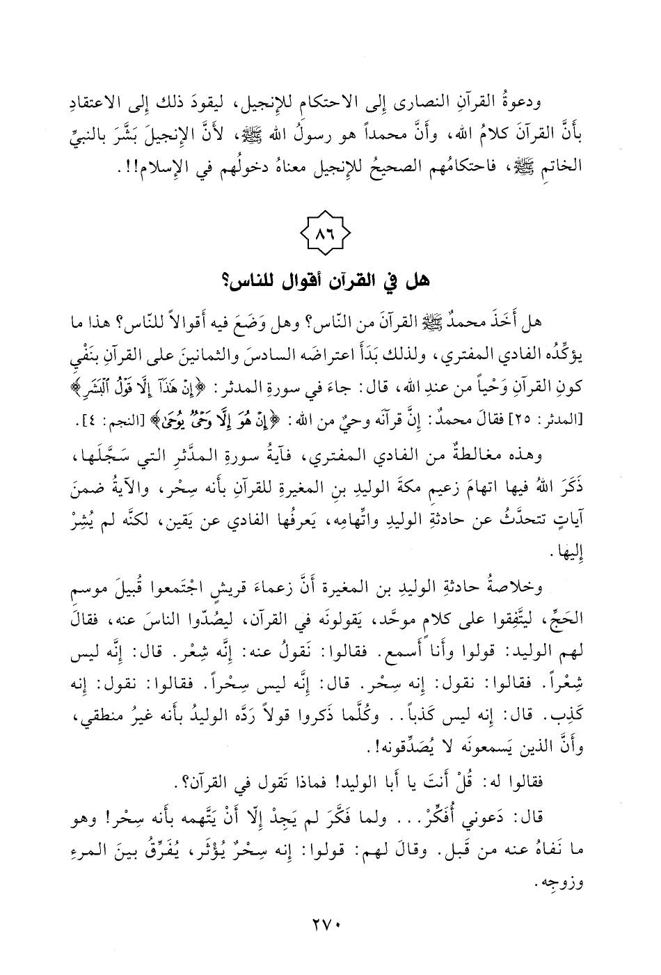 هذا ما يؤكِّدُه الفادي المفترِي، ولذلك بَدَأَ اعتراضَه السادسَ والثمانينَ على القرآنِ بنَفْي كونِ القرآنِ وَحْياً من عندِ الله، قال: جاءَ في سورةِ المدثر: (إِنْ هَذَا إِلَّا قَوْلُ الْبَشَرِ (25) .