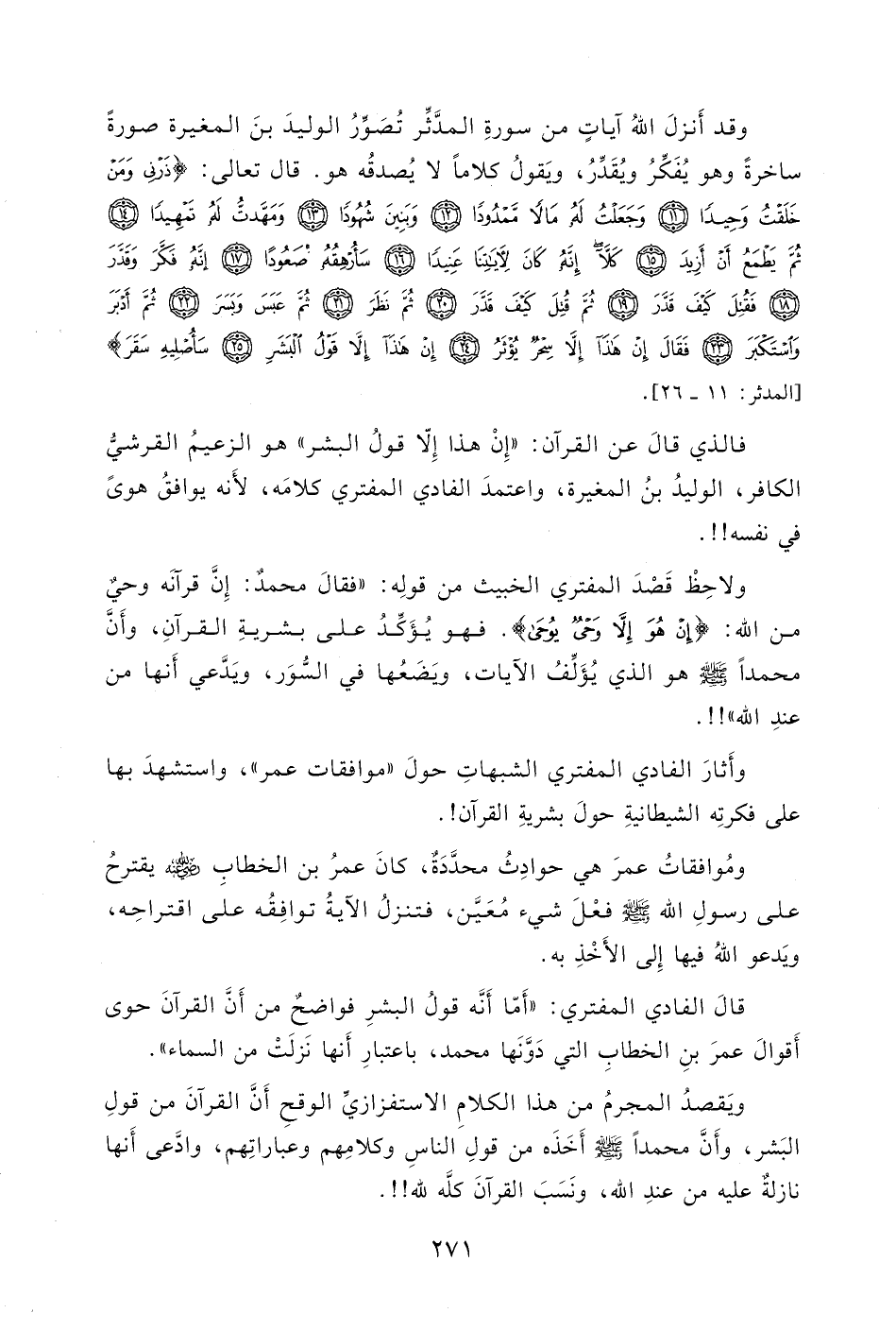 الكافر، الوليدُ بنُ المغيرة، واعتمدَ الفادي المفترِي كلامَه، لأَنه يوافقُ هوىً