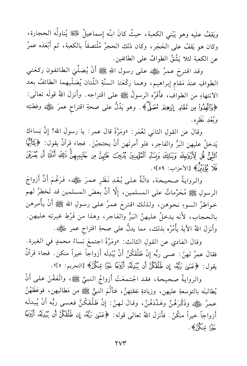 وقالَ عن القولِ الثاني لعُمَر: " ومَرَّةً قالَ عمر: يا رسولَ الله! إِنَّ نِساءَك