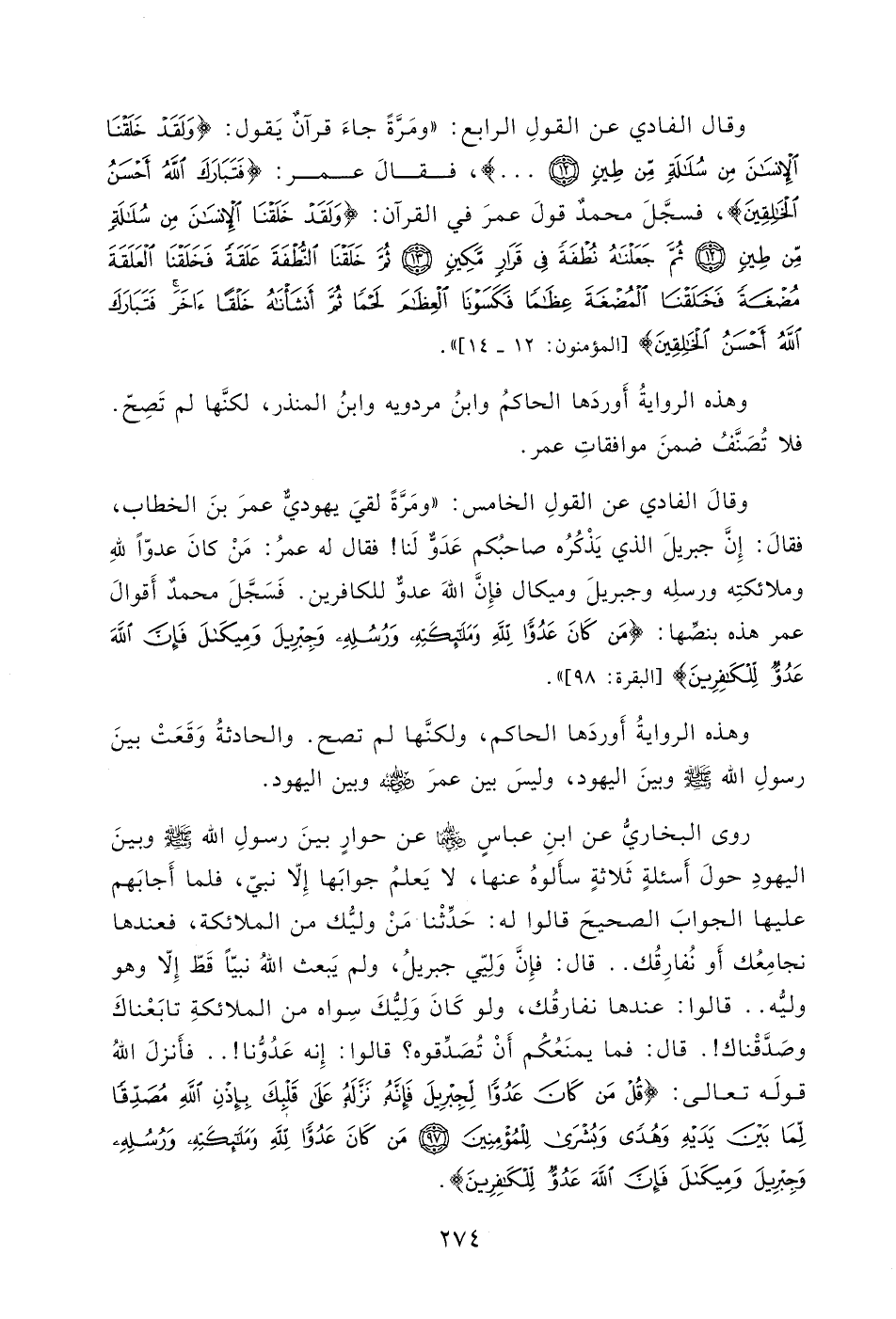 فقالَ: إِنَ جبريلَ الذي يَذْكُرُه صاحبُكم عَدَوٌّ لَنا! فقال له عمرُ: مَنْ كانَ عدوّاً للهِ وملائكتِه ورسلِه وجبريلَ وميكال فإِنَّ اللهَ عدوٌّ للكافرين.