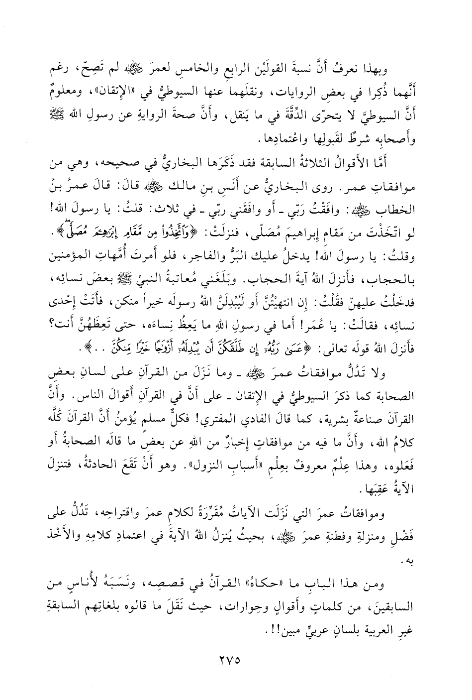ولا تَدُلُّ موافقاتُ عمرَ - رضي الله عنه - وما نَزَلَ من القرآنِ على لسانِ بعضِ الصحابة كما ذكرَ السيوطيُّ في الإِتقان - على أَنَّ في القرآنِ أَقوالَ الناس.