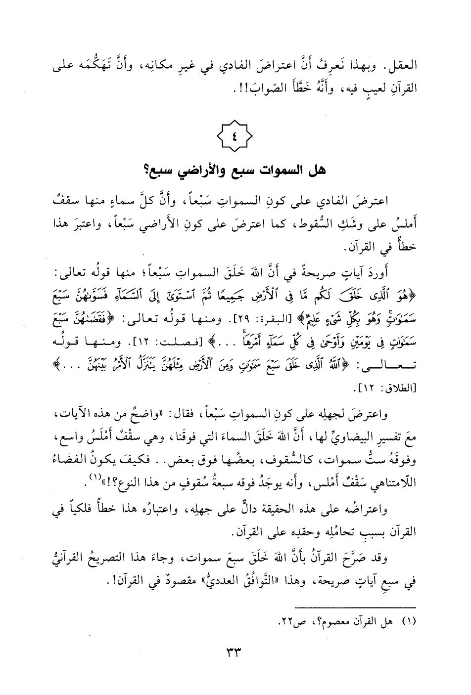 اعترضَ الفادي على كونِ السمواتِ سَبْعاً، وأَنَّ كلَّ سماءٍ منها سقفٌ