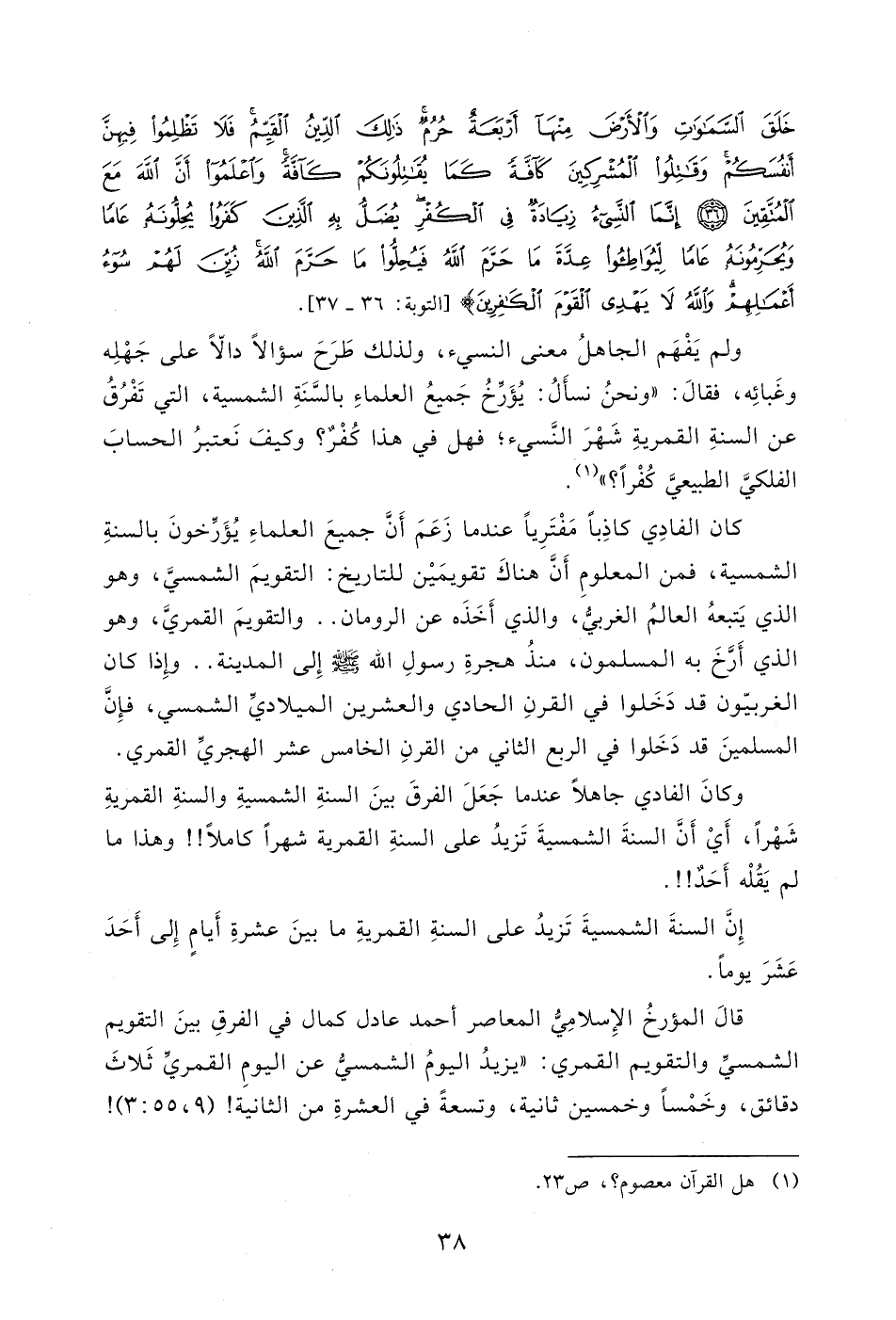 وغَبائِه، فقالَ: " ونحنُ نسأَلُ: يُؤَزخُ جَميعُ العلماءِ بالسَّنَةِ الشمسية، التي تَفْرُقُ عن السنةِ القمريةِ شَهْرَ النَسيء؟