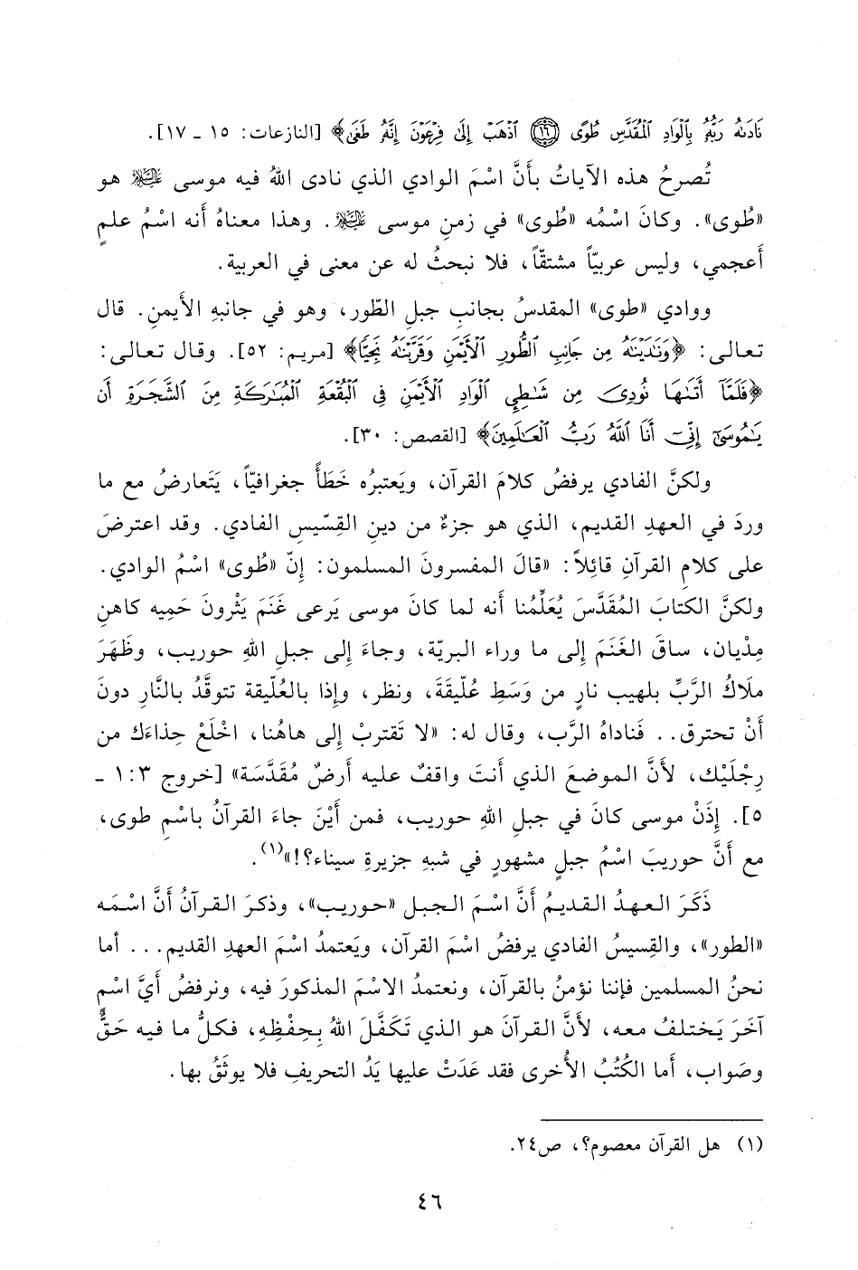 وقد اعترضَ على كلامِ القرآنِ قائِلاً: " قالَ المفسرونَ المسلمون: إِنّ " طُوى " اسْمُ الوادي.