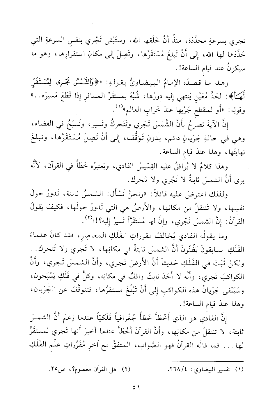 القرآنُ: إِنَّ الشمسَ تَجْري، وإِنَّ لها مُسْتَقَرَّاً تَسيرُ إِليه؟ ! ".