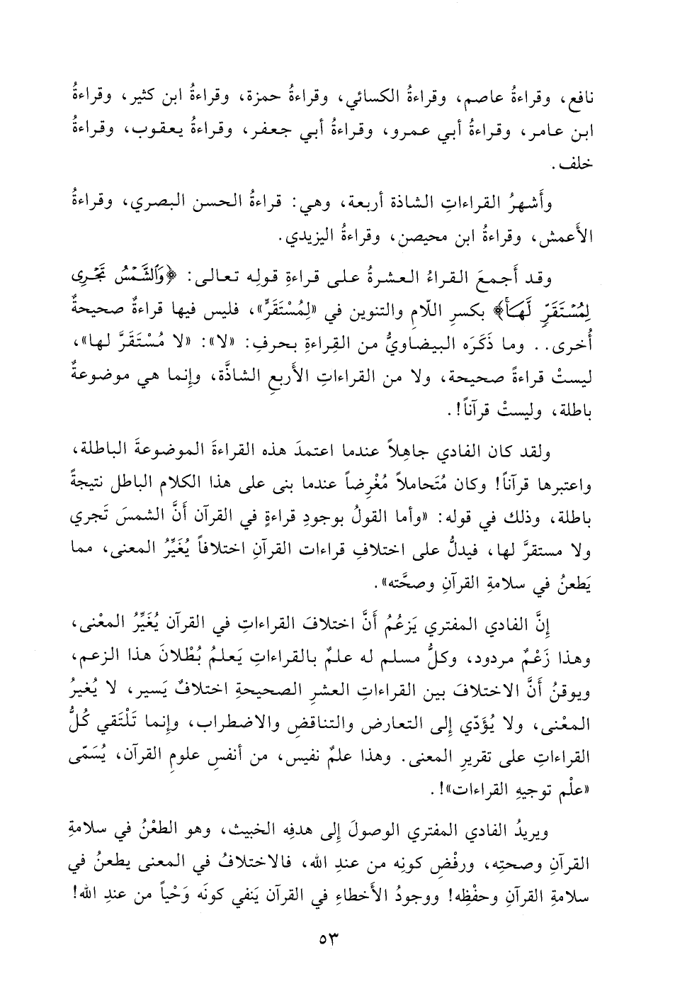واعتبرها قرآناً! وكان مُتَحاملاً مُغْرِضاً عندما بنى على هذا الكلام الباطل نتيجةً باطلة، وذلك في قوله: " وأما القولُ بوجودِ قراءةٍ في القرآن أَنَّ الشمسَ تَجري ولا مستقرَّ لها، فيدلُّ على اختلافِ قراءات القرآنِ اختلافاً يُغَيِّرُ المعنى، مما يَطعنُ في سلامةِ القرآنِ وصحَّته ".