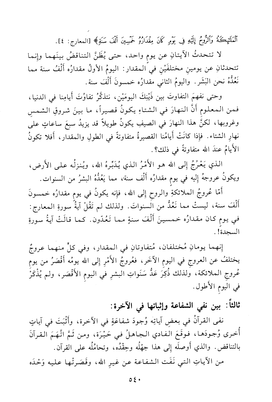 أَمّا عُروجُ الملائكةِ والروحِ إِلى الله، فإِنه يكونُ في يومٍ مقدارُه خمسونَ