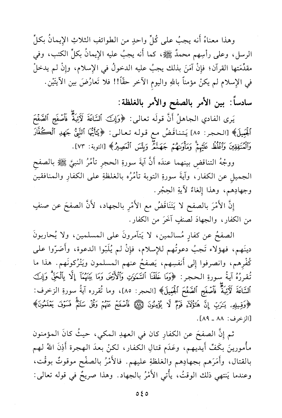 إِنَّ الأَمْرَ بالصفح لا يَتَنَاقَضُ مع الأَمْرِ بالجهاد، لأَنَّ الصفحَ عن صنفٍ