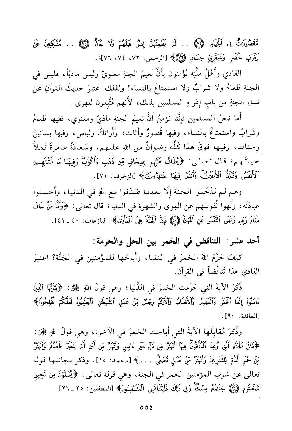 وذَكَرَ مُقابِلَها الآيةَ التي أَباحت الخمرَ في الآخرة، وهي قولُ اللهِ - عز وجل -: (مَثَلُ الْجَنَّةِ الَّتِي وُعِدَ الْمُتَّقُونَ فِيهَا أَنْهَارٌ مِنْ مَاءٍ غَيْرِ آسِنٍ وَأَنْهَارٌ مِنْ لَبَنٍ لَمْ يَتَغَيَّرْ طَعْمُهُ وَأَنْهَارٌ مِنْ خَمْرٍ لَذَّةٍ لِلشَّارِبِينَ وَأَنْهَارٌ مِنْ عَسَلٍ مُصَفًّى..)
