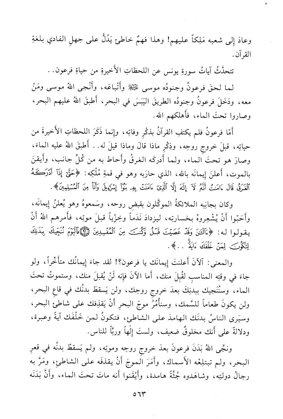 أَمّا فرعونُ فلم يكتفِ القرآنُ بذكْرِ وفاتِه، وإِنما ذَكَرَ اللحظاتِ الأَخيرةَ من