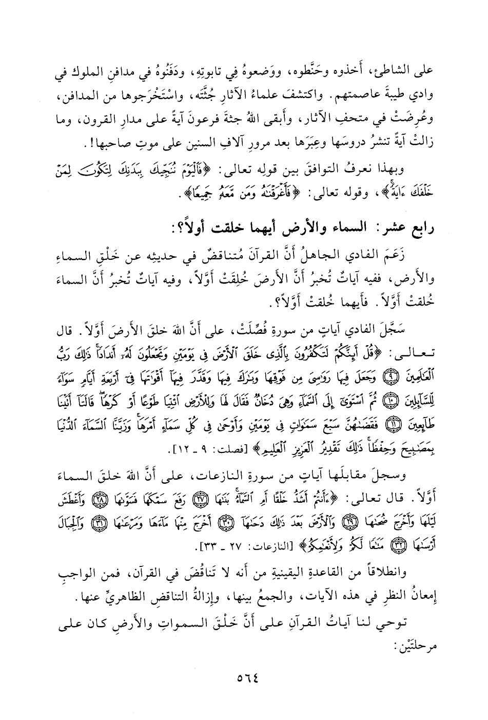 والأَرض، ففيه آياتٌ تُخبرُ أَنَّ الأَرضَ خُلِقَتْ أَولاً، وفيه آياتٌ تُخبرُ أَنَ السماءَ خُلقتْ أوَّلاً.