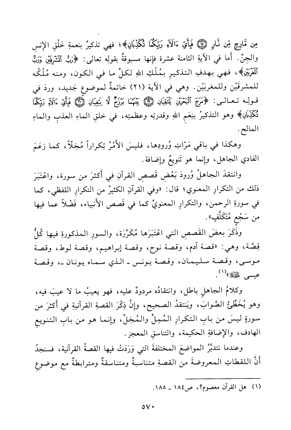 وهو يُخَطِّئُ الصَّوابَ، ويَنتقدُ الصحيح، وإِنَ ذِكْرَ القصةِ القرآنيةِ في أَكثرَ من سورةٍ ليسَ من بابِ التكرارِ المُمِلّ والمُخِلِّ، وإِنما هو من بابِ التنويعِ