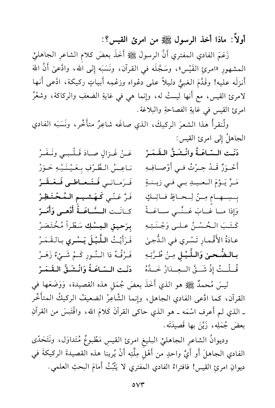 زَعَمَ الفادي المفترِي أَنَّ الرسولَ - صلى الله عليه وسلم - أَخَذَ بعضَ كلامِ الشاعرِ الجاهليِّ المشهورِ " امرئِ القَيْس "، وسَجَّلَه في القرآن، ونَسَبَه إِلى الله، وادَّعى أَنَّ اللهَ أَنزلَه عليه! وقَدَّمَ الغبيُّ دليلاً على دعْواه وزعْمِه أَبياتٍ ركيكة، ادَّعى أَنها لامرئ القيس، مع أَنها ليستْ له، وإِنما هي في غايةِ الضعفِ والركاكة، وشعْرُ امرئ القيس في غايةِ الفصاحةِ والبلاغة.