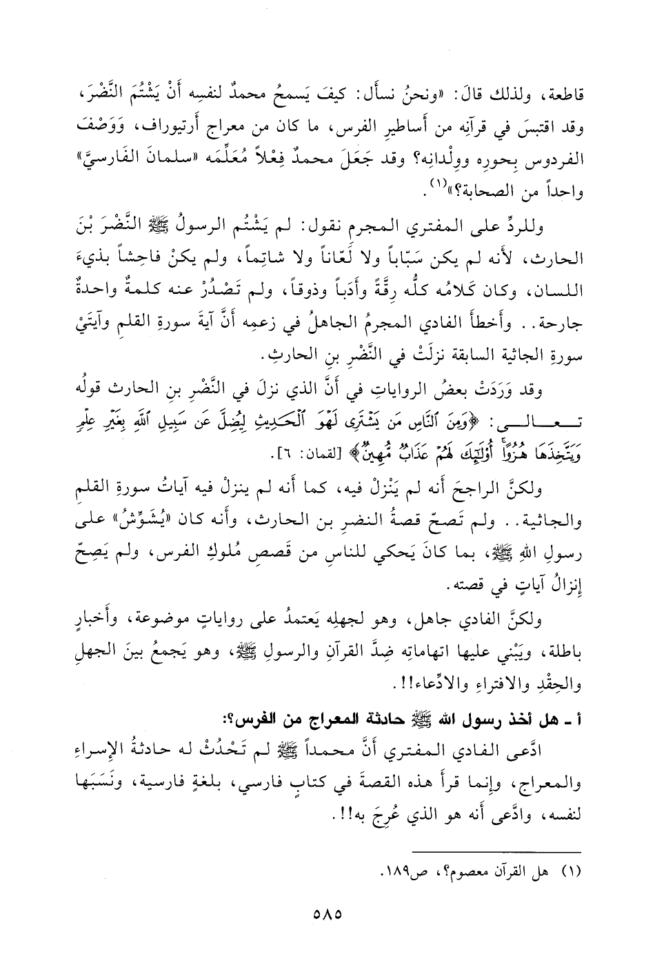 قاطعة، ولذلك قالَ: " ونحنُ نسأَل: كيفَ يَسمحُ محمدٌ لنفسِه أَنْ يَشْتُمَ النَّضْرَ، وقد اقتبسَ في قرآنِه من أَساطيرِ الفرس، ما كان من معراج أَرتيوراف، وَوَصْفَ الفردوس بِحورِه ووِلْدانِه؟