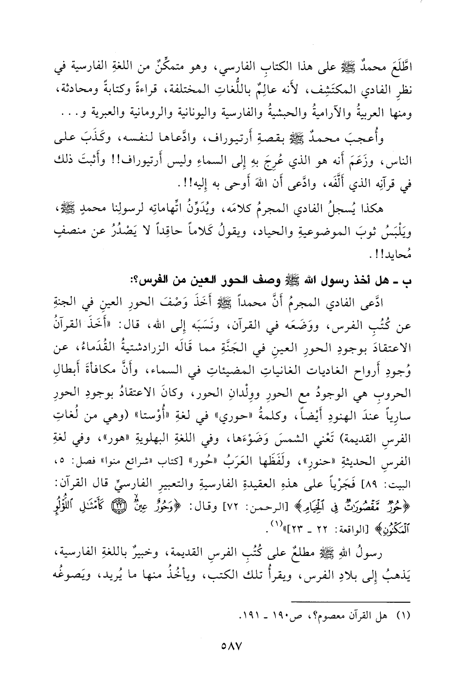 ادَّعى الفادي المجرمُ أَنَّ محمداً - صلى الله عليه وسلم - أَخَذَ وَصْفَ الحورِ العينِ في الجنةِ عن كُتُبِ الفرس، ووَضَعَه في القرآن، ونَسَبَه إِلى الله، قال: " أَخَذَ القرآنُ الاعتقادَ بوجودِ الحورِ العينِ في الجَنَّةِ مما قَالَه الزرادشتيةُ القُدَماءُ، عن وُجودِ أَرواح الغاديات الغانياتِ المضيئاتِ في السماء، وأَنَّ مكافأةَ أَبطال الحروبِ هي الوجودُ مع الحورِ ووِلْدانِ الحور، وكانَ الاعتقادُ بوجودِ الحورِ سارِياً عندَ الهنودِ أَيْضاً، وكلمةُ " حوري " في لغةِ " أُوْستا " (وهي من لُغاتِ الفرسِ القديمة) تَعْني الشمسَ وَضَوْءَها، وفي اللغةِ البهلويةِ " هور "، وفي لغةِ الفرسِ الحديثةِ " حنورِ "، ولَفَظَها العَرَبُ " حُور " أكتاب " شرائع منوا " فصل: 5، البيت: 89، فَجَرْياً على هذهِ العقيدةِ الفارسيةِ والتعبيرِ الفارسيِّ قال القرآن: (حُورٌ مَقْصُورَاتٌ فِي الْخِيَامِ (72) .