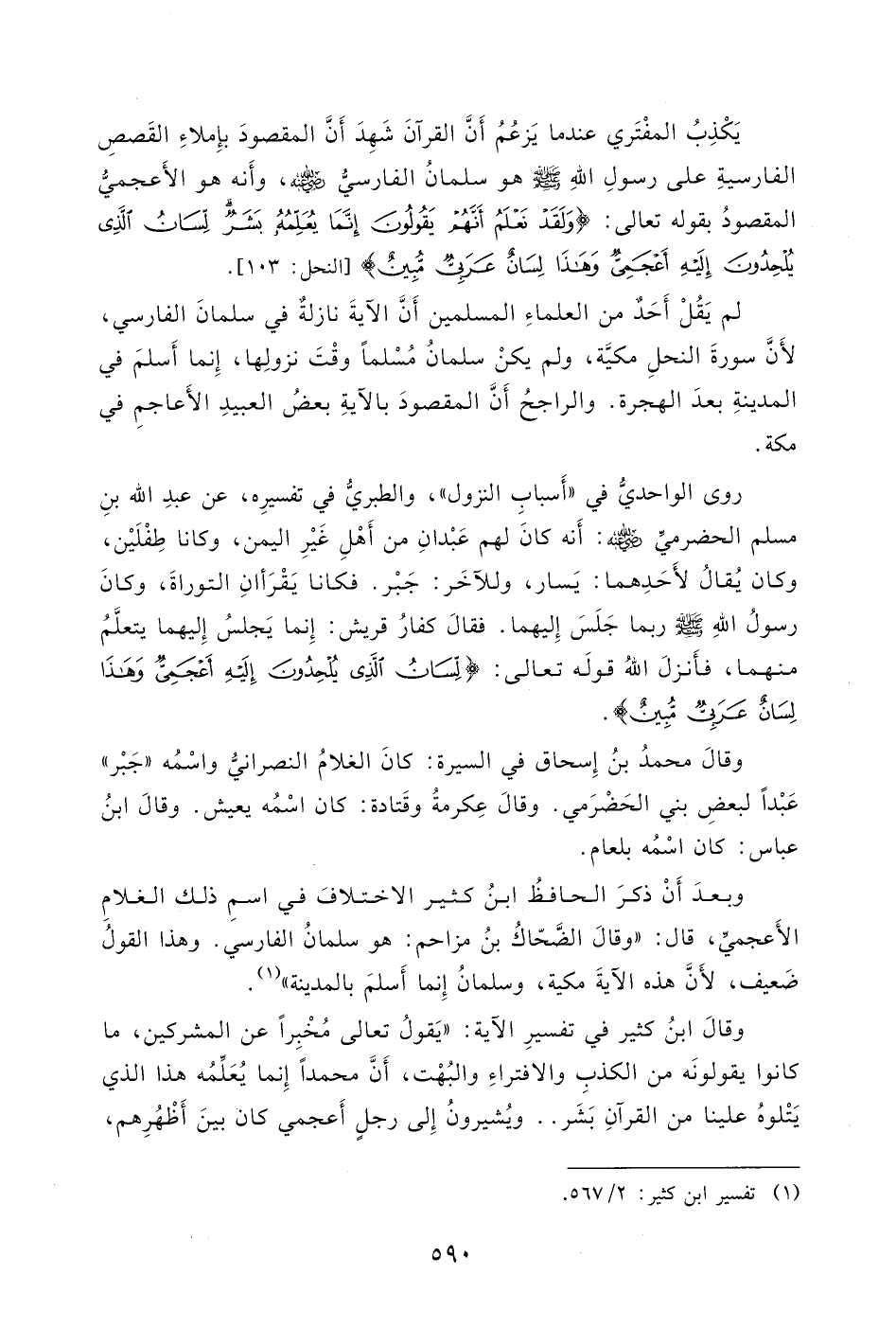 وهذا القولُ ضَعيف، لأَنَّ هذه الآيةَ مكية، وسلمانُ إِنما أَسلمَ بالمدينة ".