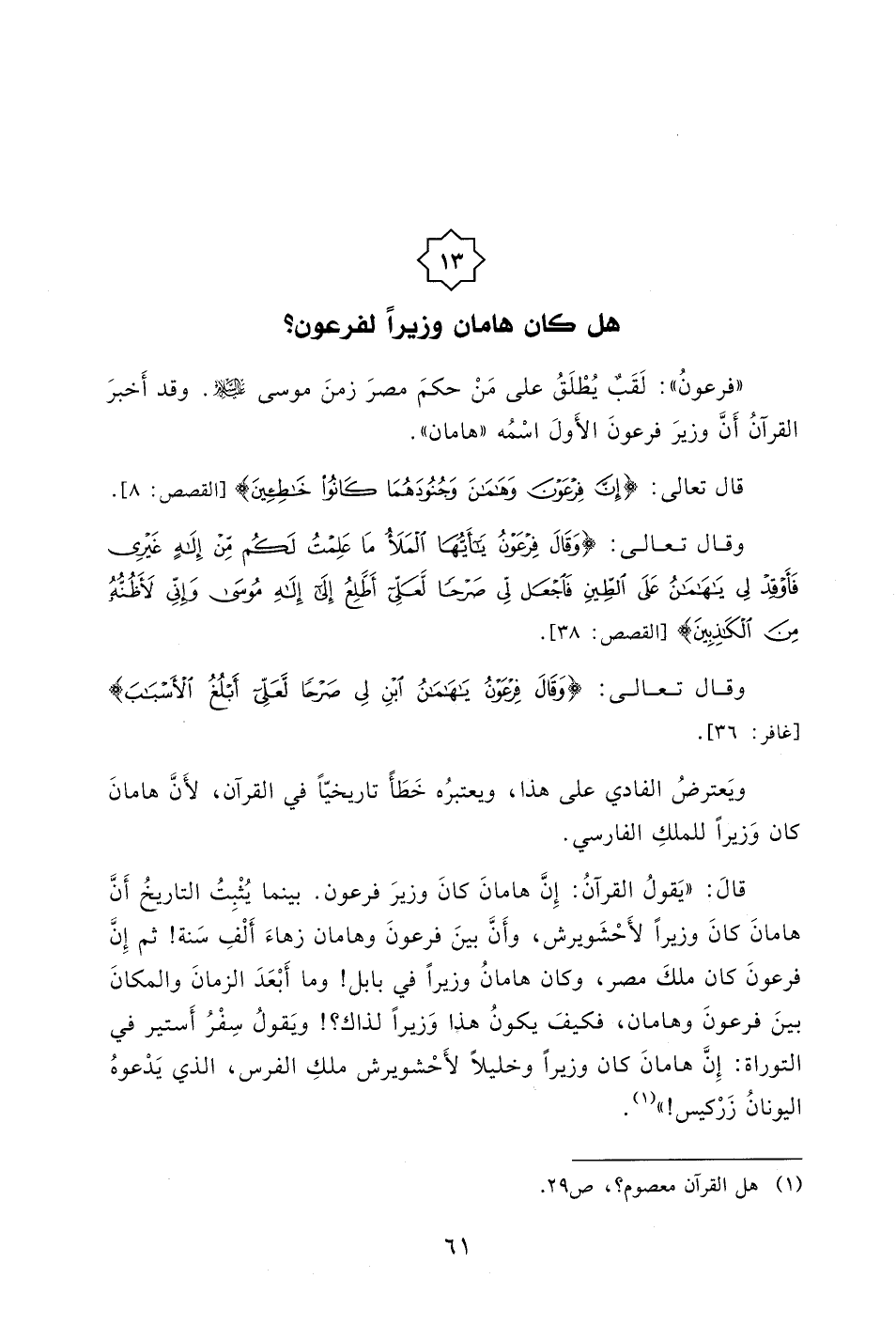 من أعلم المؤلف بأن هامان كان وزيراً لفرعون؟ وهذا السؤال على معنى أن هامان اسم شخص. ولا أحد أعلمه بأن هامان اسم شخص إلا الرواة الذين لا يوثق بمروياتهم. وإذا أصرّ على أن هامان اسم شخص. فليسلّم بأن فرعون اسم شخص. ومعلوم أنه لقب " الملك " كان لرئيس المصريين فى زمن يوسف - عليه السلام - وأن لقب " فرعون " كان لرئيس المصريين فى زمن موسى - عليه السلام - مما يدل على تغير نظام الحكم.