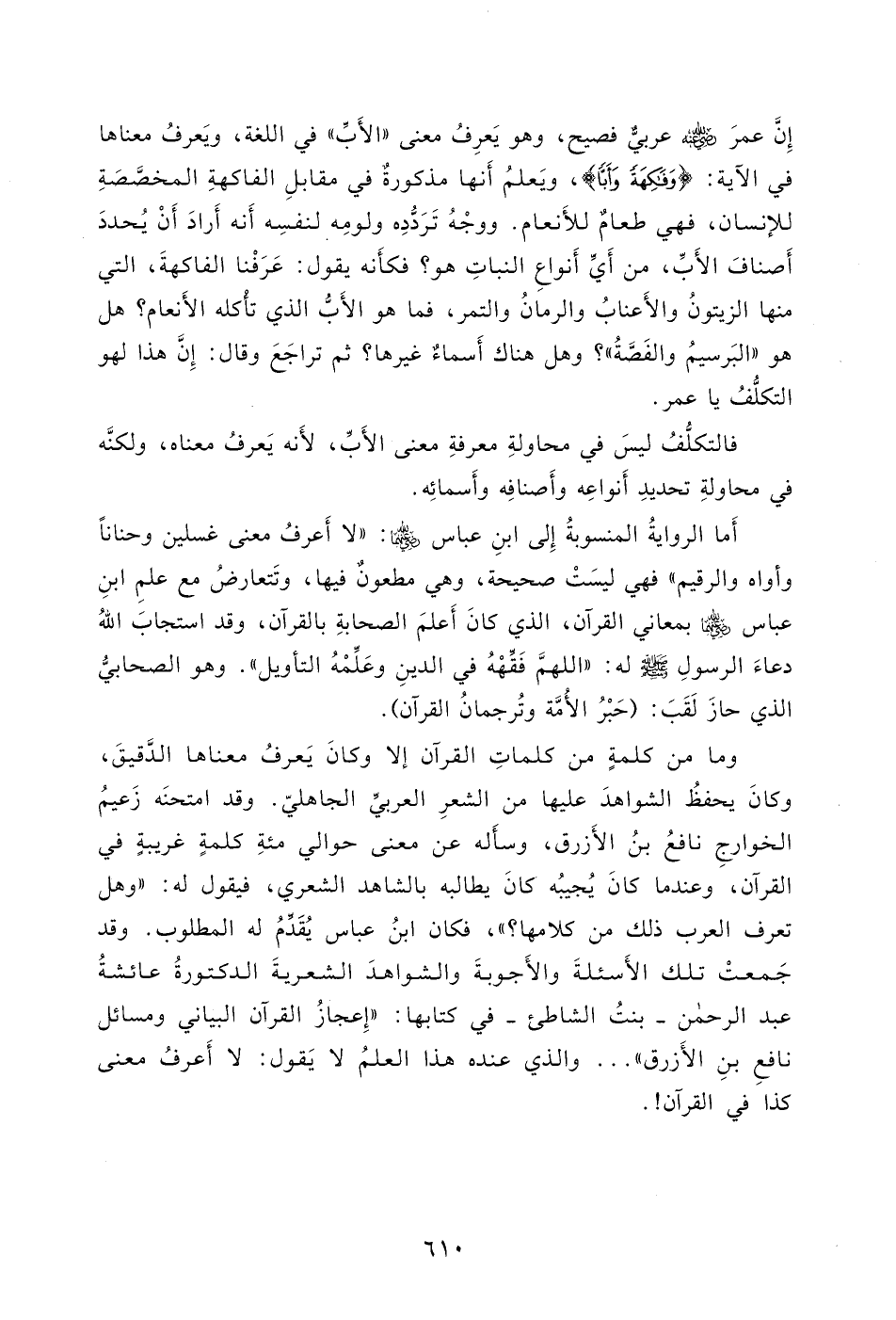 إِنَّ عمرَ - رضي الله عنه - عربيٌّ فصيح، وهو يَعرِفُ معنى " الأَبِّ " في اللغة، ويَعرفُ معناها في الآية: (وَفَاكِهَةً وَأَبًّا) ، ويَعلمُ أَنها مذكورو في مقابلِ الفاكهةِ المخصَّصةِ للإنسان، فهي طعامٌ للأَنعام.