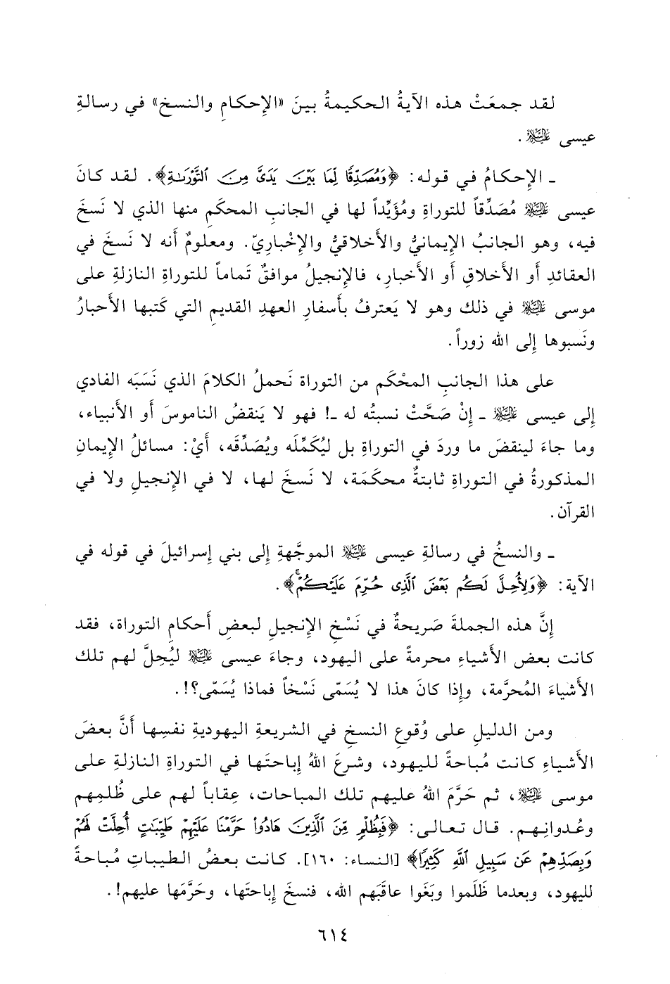 ومعلوم أَنه لا نَسخَ في العقائدِ أَو الأَخلاقِ أَو الأَخبارِ، فالإِنجيلُ موافقٌ تَماماً للتوراةِ النازلةِ على موسى - عليه السلام - في ذلك وهو لا يَعترفُ بأَسفارِ العهدِ القديمِ التي كَتبها الأَحبارُ ونَسبوها إِلى الله زوراً.