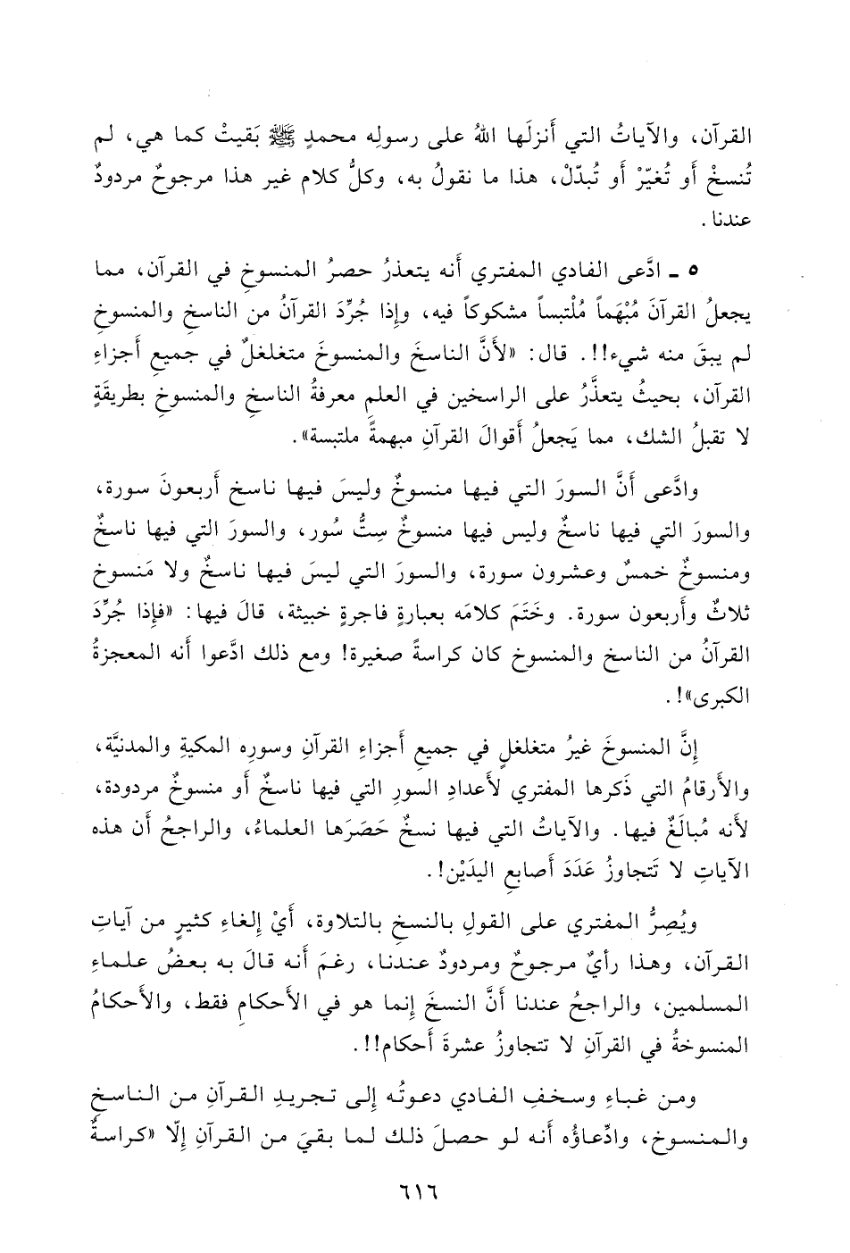 والمنسوخ، وادّعاؤُه أَنه لو حصلَ ذلك لما بقيَ من القرآنِ إِلّا " كراسة صغيرة"!!.