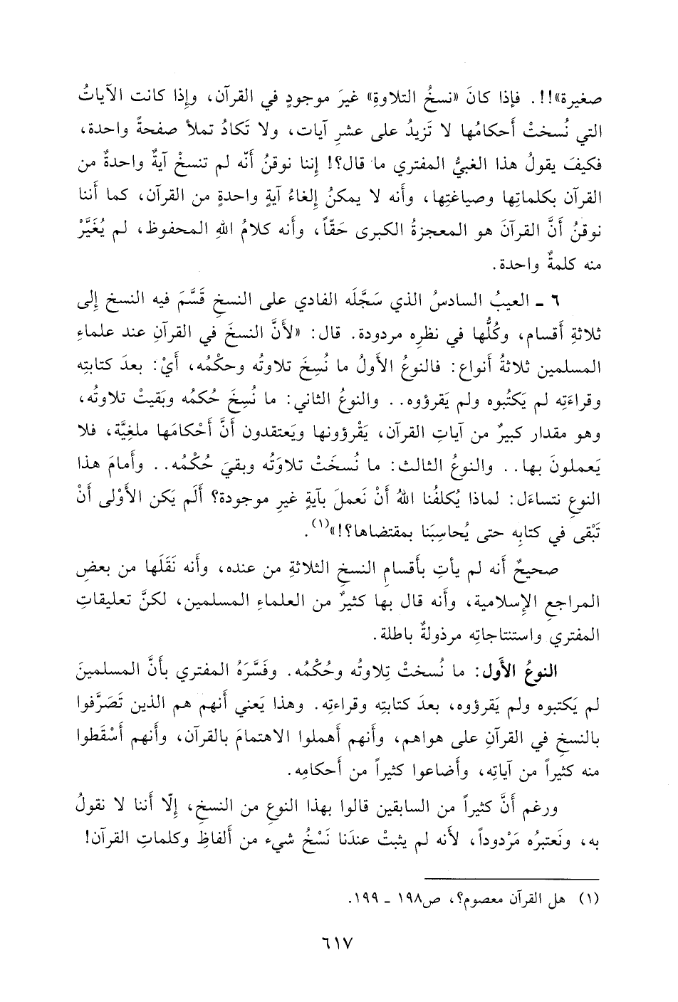 6 - العيبُ السادسُ الذي سَجَّلَه الفادي على النسخِ قَسَّمَ فيه النسخ إِلى