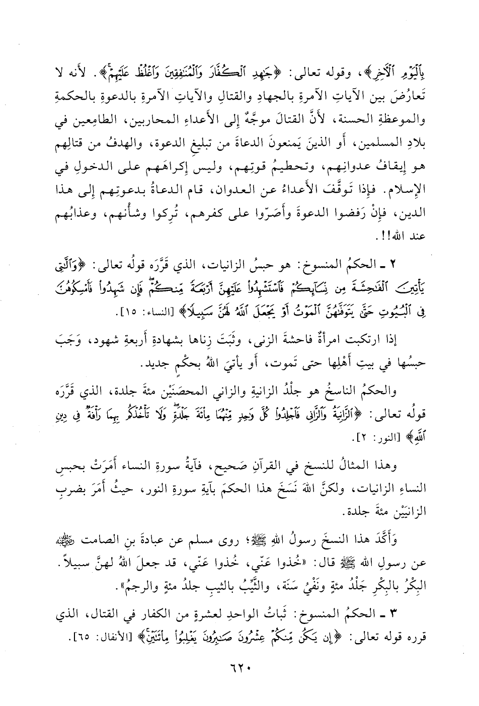 2 - الحكمُ المنسوخ: هو حبسُ الزانيات، الذي قَرَّرَه قولُه تعالى: (وَاللَّاتِي يَأْتِينَ الْفَاحِشَةَ مِنْ نِسَائِكُمْ فَاسْتَشْهِدُوا عَلَيْهِنَّ أَرْبَعَةً مِنْكُمْ فَإِنْ شَهِدُوا فَأَمْسِكُوهُنَّ فِي الْبُيُوتِ حَتَّى يَتَوَفَّاهُنَّ الْمَوْتُ أَوْ يَجْعَلَ اللَّهُ لَهُنَّ سَبِيلًا (15) .