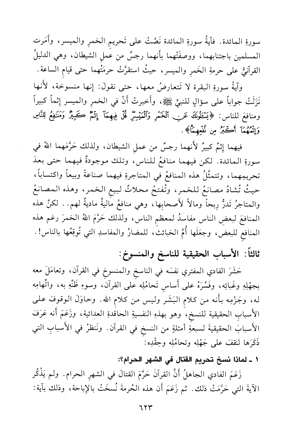 وحاوَلَ الوقوفَ على الأَسبابِ الحقيقية للنسخِ، وهو بهذهِ النفسيةِ الحاقدةِ العدائية، وزَعَمَ أَنه عَرَفَ الأَسبابَ الحقيقيةَ لسبعةِ أمثلةٍ من النسخِ في القرآن.