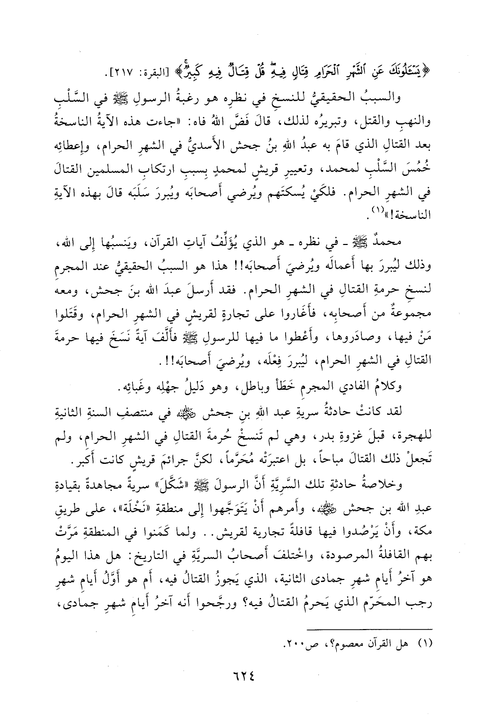 والسببُ الحقيقيُّ للنسخِ في نظرِه هو رغبةُ الرسولِ - صلى الله عليه وسلم - في السَّلْبِ والنهبِ والقتل، وتبريرُه لذلك، قالَ فَضَّ اللهُ فاه: " جاءت هذه الآية ُ الناسخةُ بعد القتالِ الذي قامَ به عبدُ اللهِ بنُ جحش الأَسديُّ في الشهرِ الحرام، وإِعطائِه خُمس السَّلْبِ لمحمد، وتعييرِ قريشٍ لمحمدٍ بِسببِ ارتكابِ المسلمين القتالَ في الشهرِ الحرام.