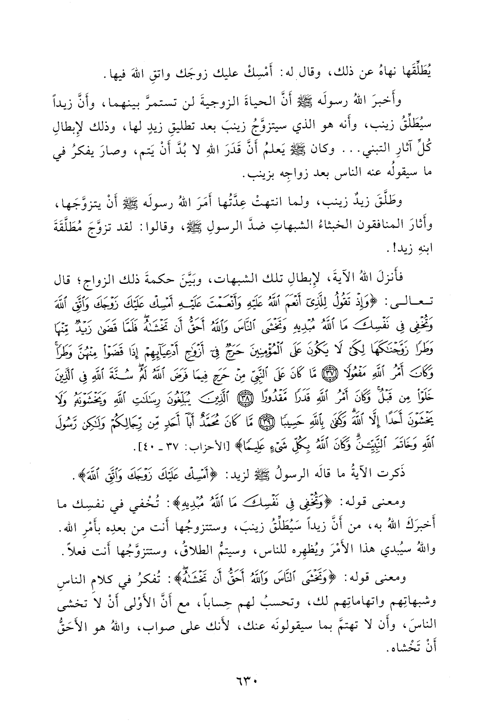 تعالى: (وَإِذْ تَقُولُ لِلَّذِي أَنْعَمَ اللَّهُ عَلَيْهِ وَأَنْعَمْتَ عَلَيْهِ أَمْسِكْ عَلَيْكَ زَوْجَكَ وَاتَّقِ اللَّهَ وَتُخْفِي فِي نَفْسِكَ مَا اللَّهُ مُبْدِيهِ وَتَخْشَى النَّاسَ وَاللَّهُ أَحَقُّ أَنْ تَخْشَاهُ فَلَمَّا قَضَى زَيْدٌ مِنْهَا وَطَرًا زَوَّجْنَاكَهَا لِكَيْ لَا يَكُونَ عَلَى الْمُؤْمِنِينَ حَرَجٌ فِي أَزْوَاجِ أَدْعِيَائِهِمْ إِذَا قَضَوْا مِنْهُنَّ وَطَرًا وَكَانَ أَمْرُ اللَّهِ مَفْعُولًا (37) مَا كَانَ عَلَى النَّبِيِّ مِنْ حَرَجٍ فِيمَا فَرَضَ اللَّهُ لَهُ سُنَّةَ اللَّهِ فِي الَّذِينَ خَلَوْا مِنْ قَبْلُ وَكَانَ أَمْرُ اللَّهِ قَدَرًا مَقْدُورًا (38) الَّذِينَ يُبَلِّغُونَ رِسَالَاتِ اللَّهِ وَيَخْشَوْنَهُ وَلَا يَخْشَوْنَ أَحَدًا إِلَّا اللَّهَ وَكَفَى بِاللَّهِ حَسِيبًا (39) مَا كَانَ مُحَمَّدٌ أَبَا أَحَدٍ مِنْ رِجَالِكُمْ وَلَكِنْ رَسُولَ اللَّهِ وَخَاتَمَ النَّبِيِّينَ وَكَانَ اللَّهُ بِكُلِّ شَيْءٍ عَلِيمًا (40) .