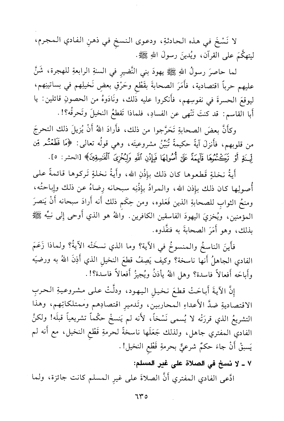 التشريعُ الذي قررَتْه لا يُسمى نَسْخاً، لأَنه لم يَنسخْ حكْماً تشريعياً قبلَه! ولكنَّ الفادي المفترِي جاهل، ولذلك جَعَلَها ناسخةً لحرمةِ قَطْعِ النخيل، مع أَنه لم يَسبقْ أَنْ جاءَ حكمٌ شرعيٌّ بحرمةِ قَطْعِ النخيل!.