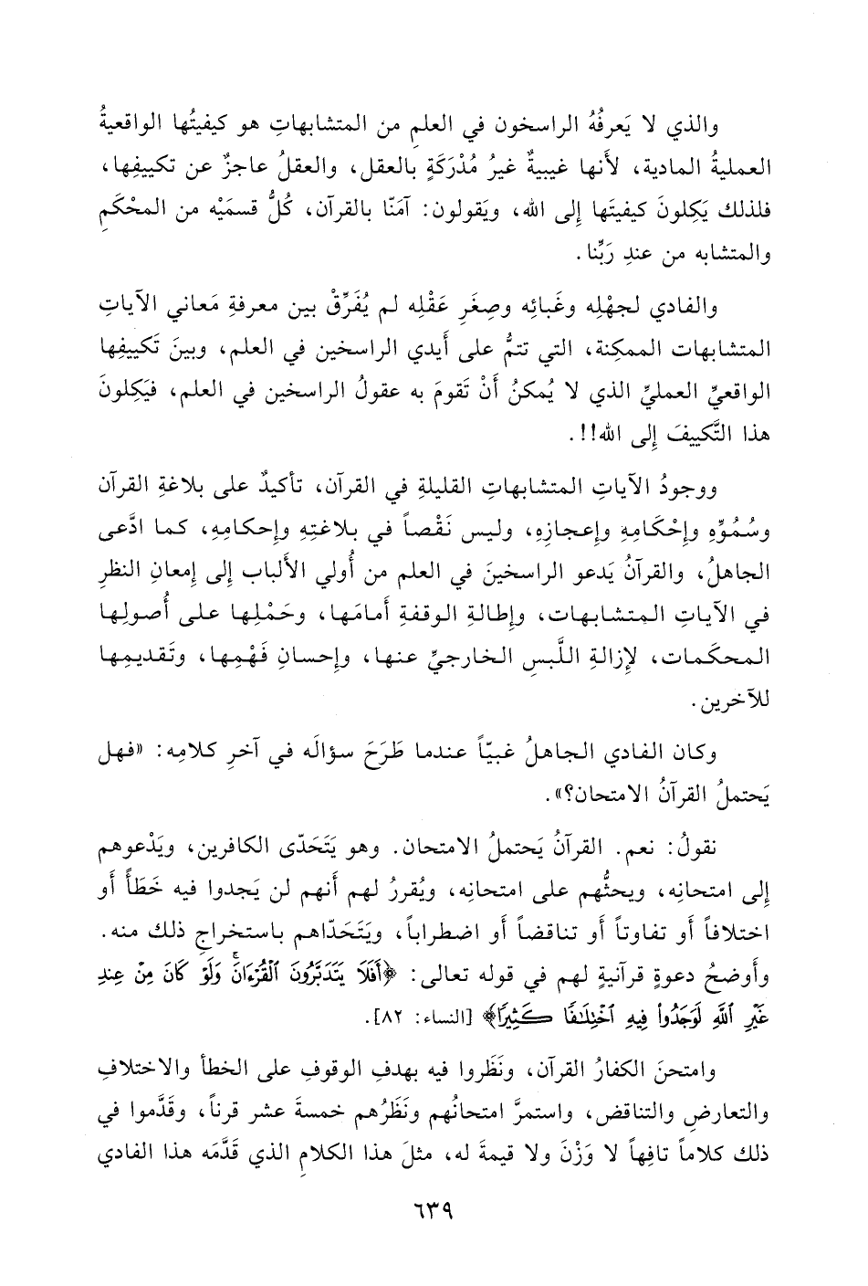 وهو يَتَحَدّى الكافرين، ويَدْعوهم إِلى امتحانِه، ويحثُّهم على امتحانِه، ويُقررُ لهم أَنهم لن يَجدوا فيه خَطَأً أَو اختلافاً أَو تفاوتاً أَو تناقضاً أَو اضطراباً، ويَتَحَدّاهم باستخراجِ ذلك منه.