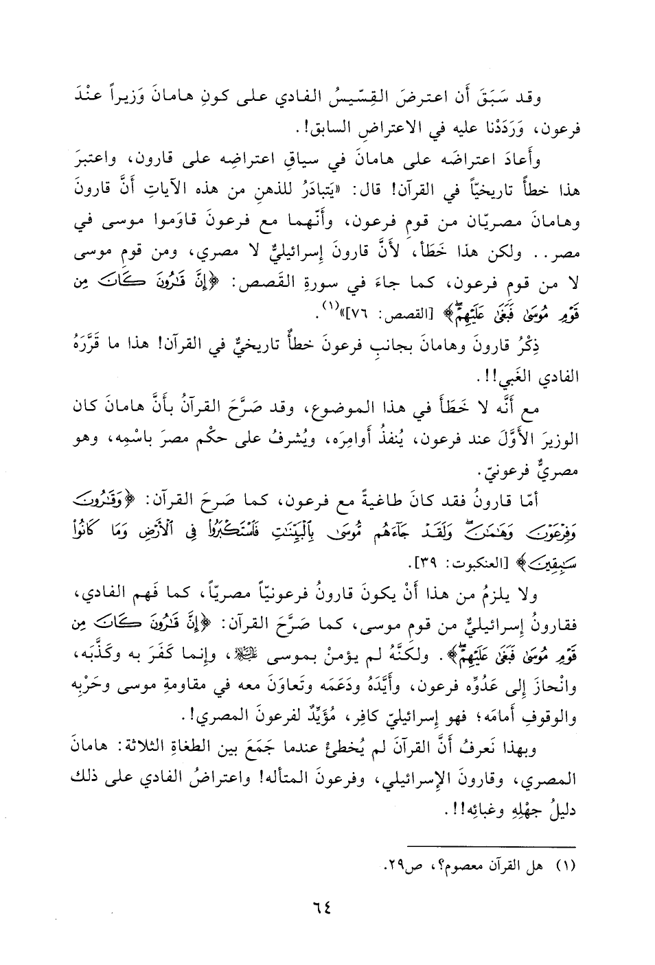 هذا خطأً تاريخيّاً في القرآن! قال: " يَتبادَرُ للذهنِ من هذه الآيات ِ أَنَّ قارونَ