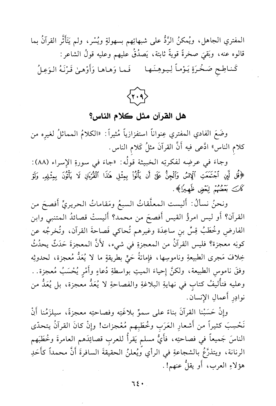 وإِنْ كانَ القرآنُ يتحدّى الناسَ جَميعاً في فصاحتِه، فأَي مسلمٍ يَقرأُ للعربِ قصائِدَهم العامرةَ وخُطَبَهم الرنانة، ويتذرَّعُ بالشجاعةِ في الرأي ويُعلنُ الحقيقةَ السافرةَ أَنَّ محمداً كأَحَدِ هؤلاءِ العرب، أَو يقل عنهم!.