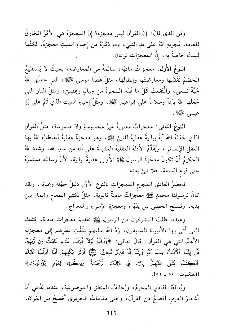 النوعُ الثاني: معجزاتٌ معنويةٌ غيرُ محسوسةٍ ولا ملموسة، مثلُ القرآنِ