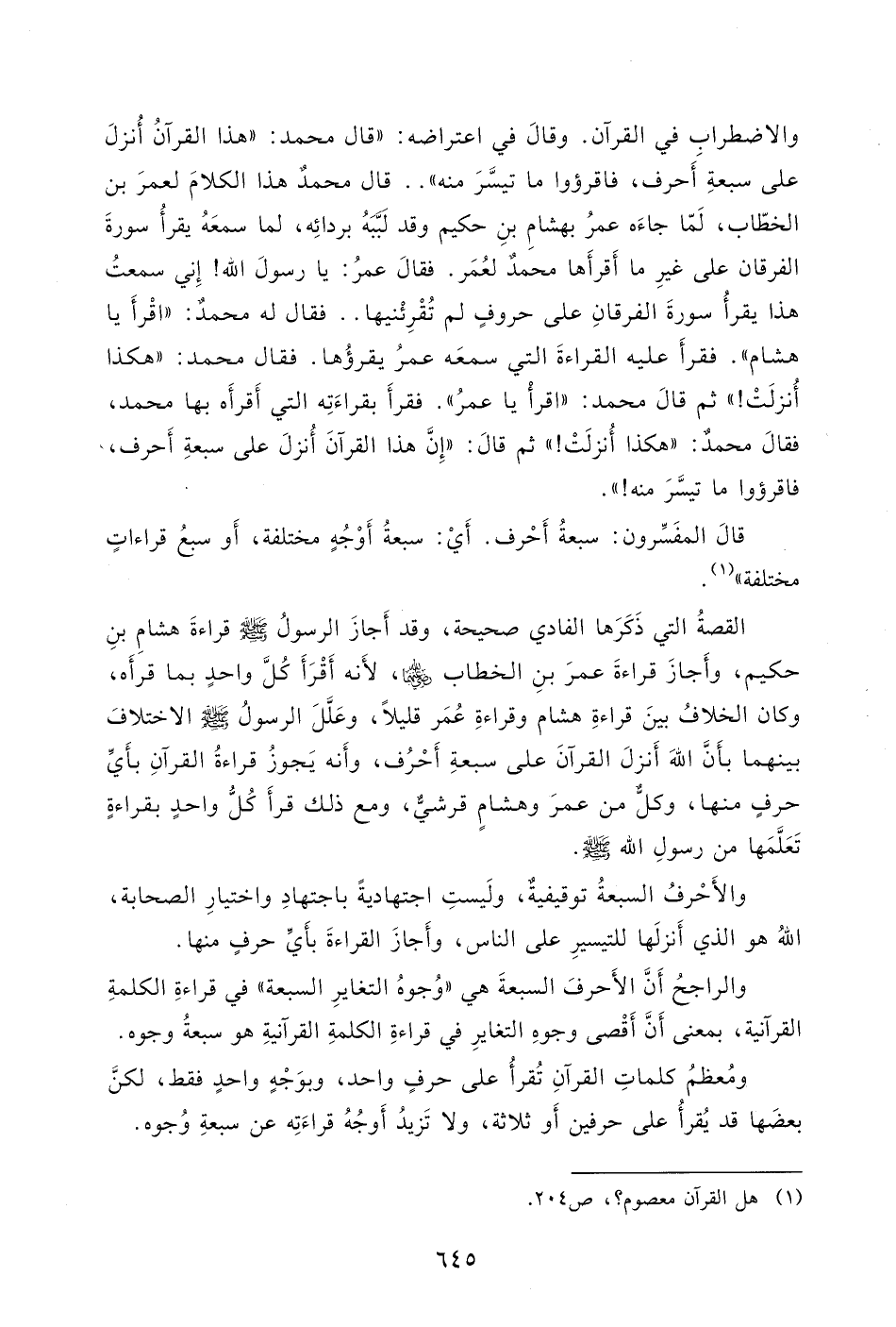 وقالَ في اعتراضه: " قال محمد: " هذا القرآنُ أُنزلَ على سبعةِ أَحرف، فاقرؤوا ما تيسَّرَ منه "..