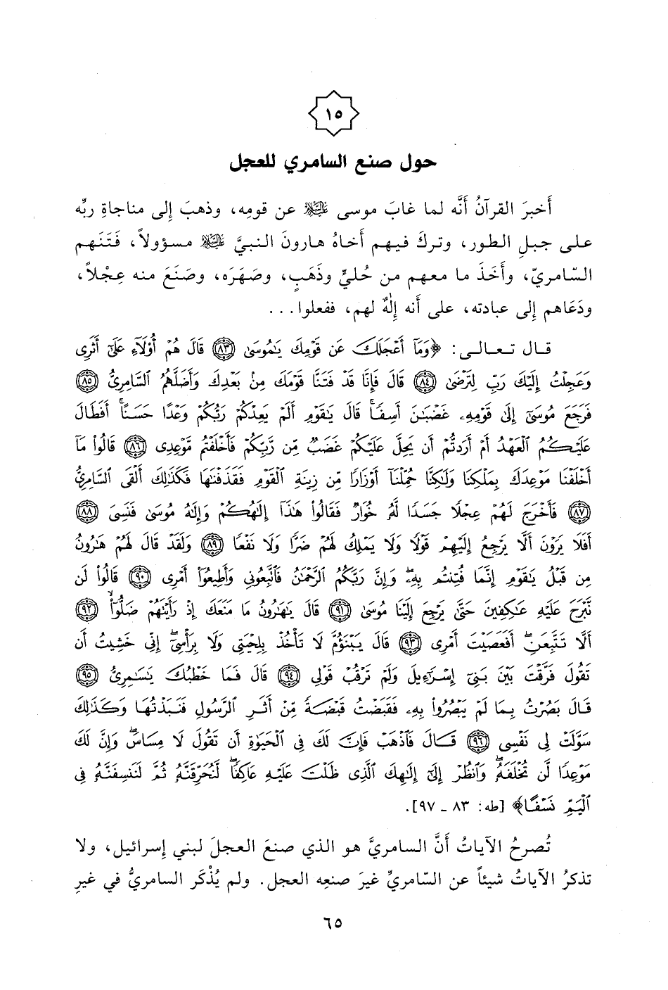 قال تعالى: (وَمَا أَعْجَلَكَ عَنْ قَوْمِكَ يَا مُوسَى (83) قَالَ هُمْ أُولَاءِ عَلَى أَثَرِي وَعَجِلْتُ إِلَيْكَ رَبِّ لِتَرْضَى (84) قَالَ فَإِنَّا قَدْ فَتَنَّا قَوْمَكَ مِنْ بَعْدِكَ وَأَضَلَّهُمُ السَّامِرِيُّ (85) فَرَجَعَ مُوسَى إِلَى قَوْمِهِ غَضْبَانَ أَسِفًا قَالَ يَا قَوْمِ أَلَمْ يَعِدْكُمْ رَبُّكُمْ وَعْدًا حَسَنًا أَفَطَالَ عَلَيْكُمُ الْعَهْدُ أَمْ أَرَدْتُمْ أَنْ يَحِلَّ عَلَيْكُمْ غَضَبٌ مِنْ رَبِّكُمْ فَأَخْلَفْتُمْ مَوْعِدِي (86) قَالُوا مَا أَخْلَفْنَا مَوْعِدَكَ بِمَلْكِنَا وَلَكِنَّا حُمِّلْنَا أَوْزَارًا مِنْ زِينَةِ الْقَوْمِ فَقَذَفْنَاهَا فَكَذَلِكَ أَلْقَى السَّامِرِيُّ (87) فَأَخْرَجَ لَهُمْ عِجْلًا جَسَدًا لَهُ خُوَارٌ فَقَالُوا هَذَا إِلَهُكُمْ وَإِلَهُ مُوسَى فَنَسِيَ (88) أَفَلَا يَرَوْنَ أَلَّا يَرْجِعُ إِلَيْهِمْ قَوْلًا وَلَا يَمْلِكُ لَهُمْ ضَرًّا وَلَا نَفْعًا (89) وَلَقَدْ قَالَ لَهُمْ هَارُونُ مِنْ قَبْلُ يَا قَوْمِ إِنَّمَا فُتِنْتُمْ بِهِ وَإِنَّ رَبَّكُمُ الرَّحْمَنُ فَاتَّبِعُونِي وَأَطِيعُوا أَمْرِي (90) قَالُوا لَنْ نَبْرَحَ عَلَيْهِ عَاكِفِينَ حَتَّى يَرْجِعَ إِلَيْنَا مُوسَى (91) قَالَ يَا هَارُونُ مَا مَنَعَكَ إِذْ رَأَيْتَهُمْ ضَلُّوا (92) أَلَّا تَتَّبِعَنِ أَفَعَصَيْتَ أَمْرِي (93) قَالَ يَبْنَؤُمَّ لَا تَأْخُذْ بِلِحْيَتِي وَلَا بِرَأْسِي إِنِّي خَشِيتُ أَنْ تَقُولَ فَرَّقْتَ بَيْنَ بَنِي إِسْرَائِيلَ وَلَمْ تَرْقُبْ قَوْلِي (94) قَالَ فَمَا خَطْبُكَ يَا سَامِرِيُّ (95) قَالَ بَصُرْتُ بِمَا لَمْ يَبْصُرُوا بِهِ فَقَبَضْتُ قَبْضَةً مِنْ أَثَرِ الرَّسُولِ فَنَبَذْتُهَا وَكَذَلِكَ سَوَّلَتْ لِي نَفْسِي (96) قَالَ فَاذْهَبْ فَإِنَّ لَكَ فِي الْحَيَاةِ أَنْ تَقُولَ لَا مِسَاسَ وَإِنَّ لَكَ مَوْعِدًا لَنْ تُخْلَفَهُ وَانْظُرْ إِلَى إِلَهِكَ الَّذِي ظَلْتَ عَلَيْهِ عَاكِفًا لَنُحَرِّقَنَّهُ ثُمَّ لَنَنْسِفَنَّهُ فِي الْيَمِّ نَسْفًا (97) .
