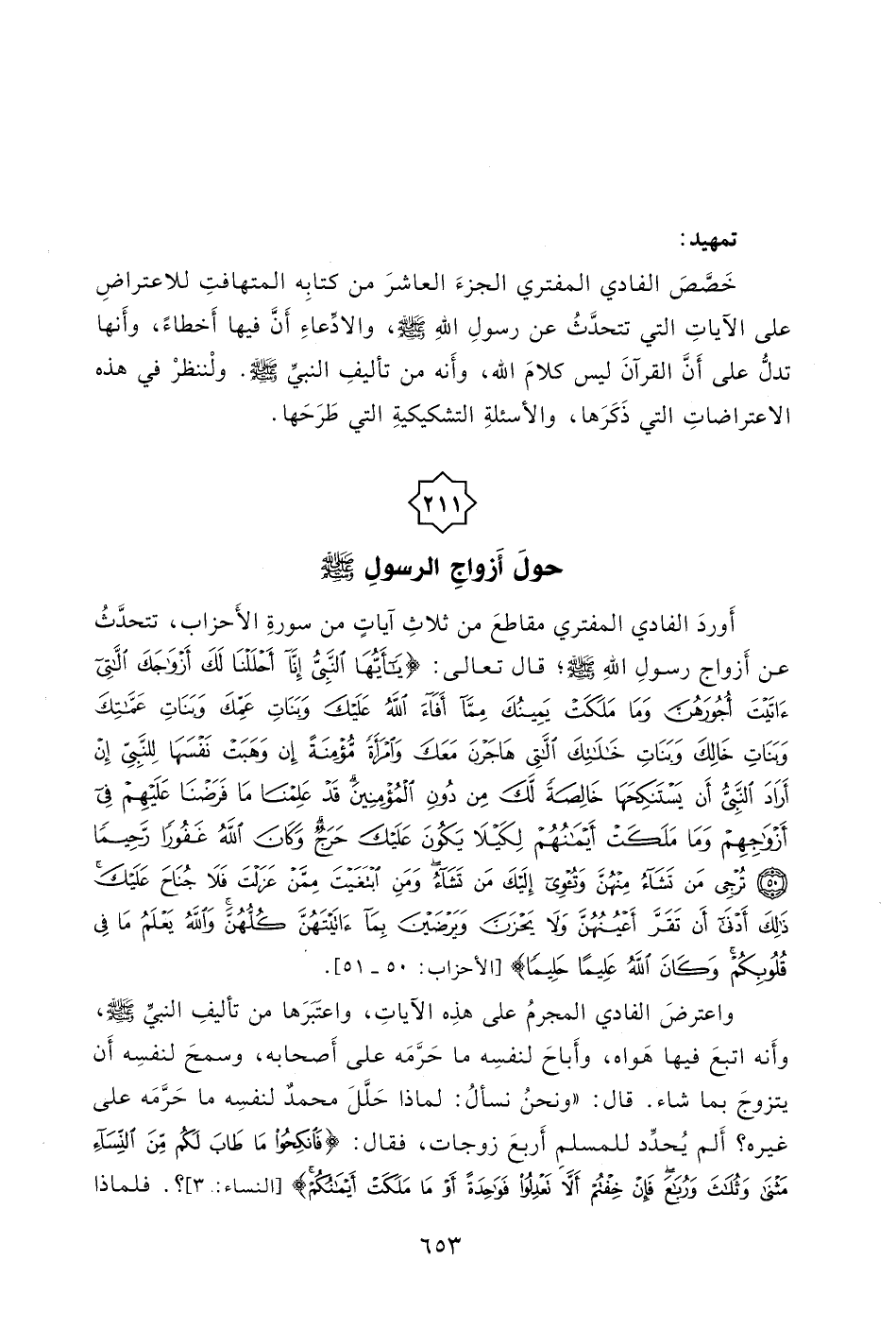 واعترضَ الفادي المجرمُ على هذِه الآياتِ، واعتَبَرَها من تأليفِ النبيّ - صلى الله عليه وسلم -، وأَنه اتبعَ فيها هَواه، وأَباحَ لنفسِه ما حَرَّمَه على أَصحابه، وسمحَ لنفسِه أَن يتزوجَ بما شاء.