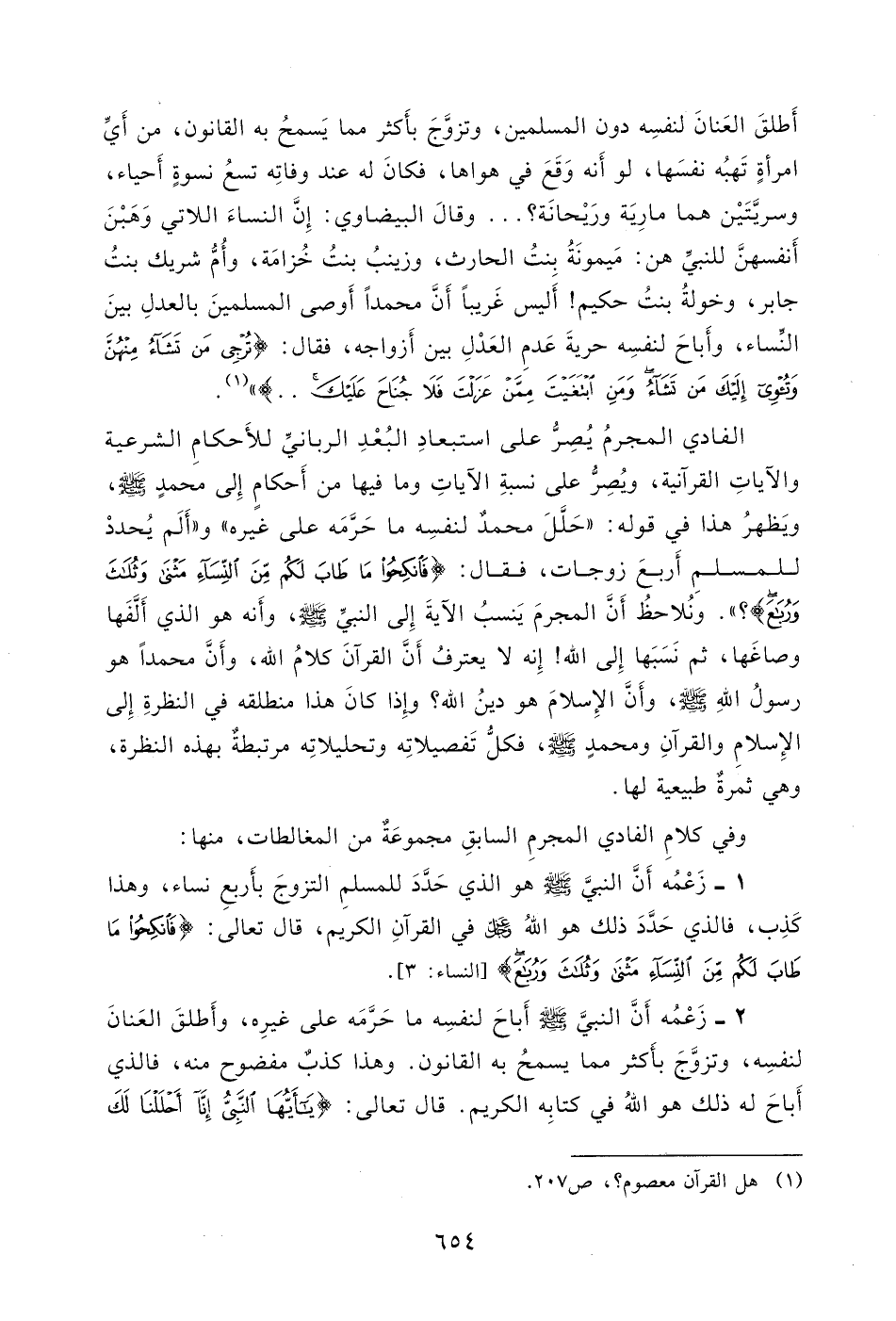 والآياتِ القرآنية، ويُصِرُّ على نسبةِ الآياتِ وما فيها من أَحكامٍ إِلى محمدٍ - صلى الله عليه وسلم -، ويَظهرُ هذا في قوله: " حَلَّلَ محمدٌ لنفسِه ما حَرمَه على غيره " و " أَلَم يُحددْ للمسلمِ أَربعَ زوجات، فقال: (فَانْكِحُوا مَا طَابَ لَكُمْ مِنَ النِّسَاءِ مَثْنَى وَثُلَاثَ وَرُبَاعَ) ؟ " (1) .