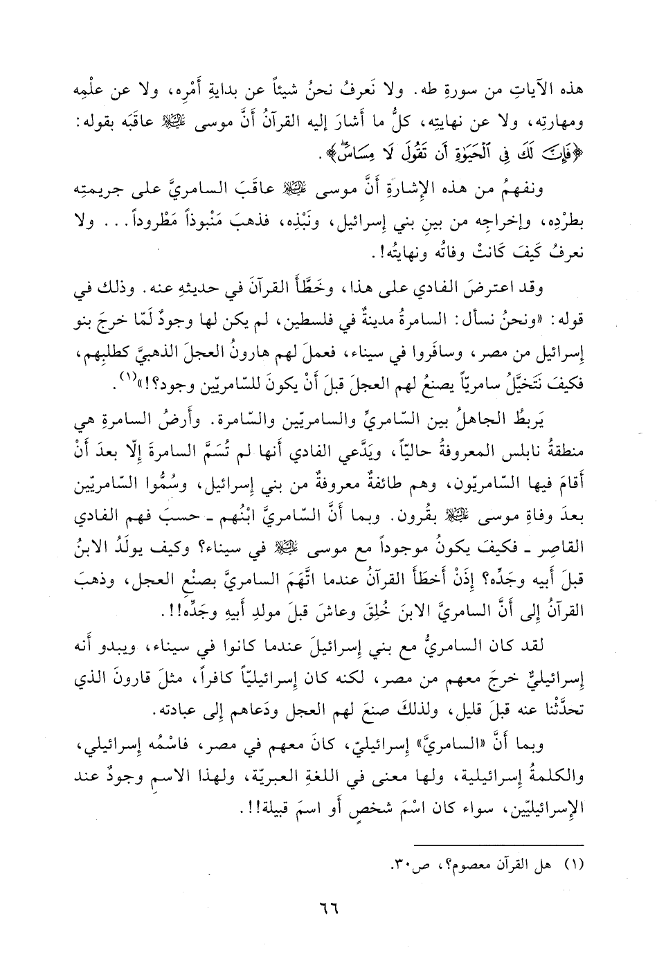 وذلك في قولهْ " ونحنُ نسأل: السامرةُ مدينةٌ في فلسطين، لم يكن لها وجودٌ لَمّا خرجَ بنو إِسرائيل من مصر، وسافَروا في سيناء، فعملَ لهم هارونُ العجلَ الذهبيَّ كطلبِهم، فكيفَ نَتَخيَّلُ سامريّاً يصنعُ لهم العجلَ قبلَ أَنْ يكونَ للسّامريّين وجود؟ ! " (1) .