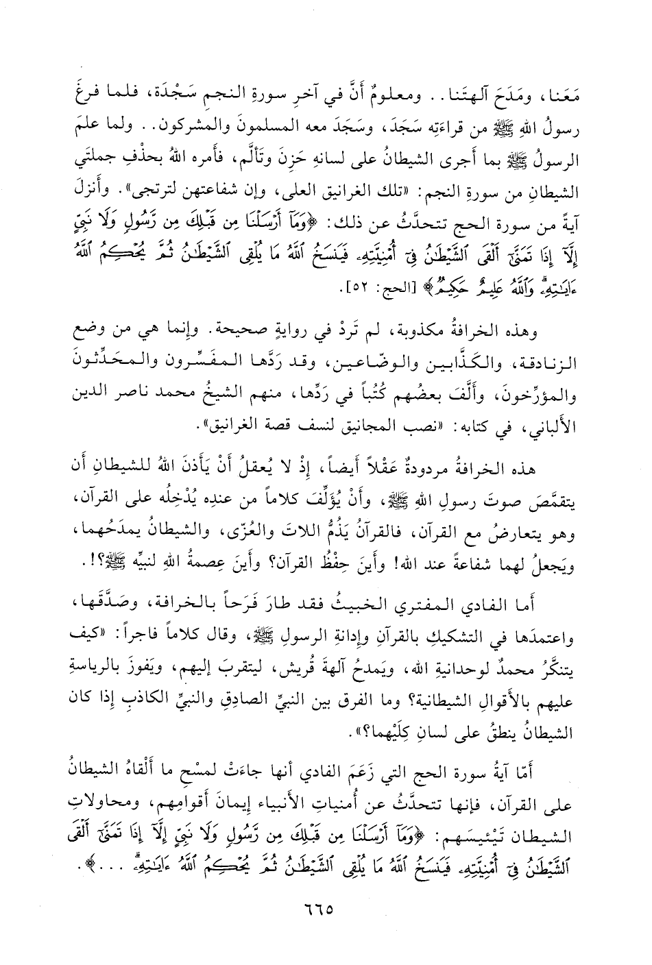وإِنما هي من وضع الزنادقة، والكَذَّابين والوضّاعين، وقد رَدَّها المفَسِّرون والمحَدِّثونَ والمؤرِّخونَ، وأَلَّفَ بعضُهم كتُباً في رَدِّها، منهم الشيخُ محمد ناصر الدين الأَلباني، في كتابه: " نصب المجانيق لنسف قصة الغرانيق ".