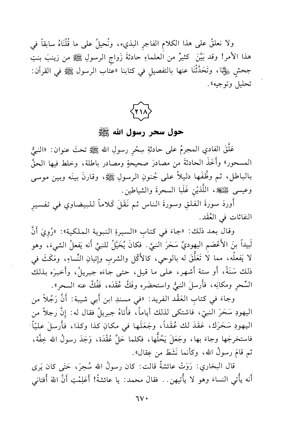 فكانَ يُخَيَّلُ للنبيِّ أَنه يَفعلُ الشيءَ، وهو لا يَفعلُه، مما لا تَعَلُّقَ له بالوحي، كالأَكْل والشربِ وإِتيانِ النِّساءِ، ومَكَثَ في ذلك سَنَةً، أَو ستة أَشهر، على ما قيل، حتى جاءَه جبريلُ، وأَخبرَه بذلك السِّحرِ ومكانِه، فأَرسلَ النبيُّ واستحضَره وفَك عُقَدَه، فَفُكَّ عنه السحر ".