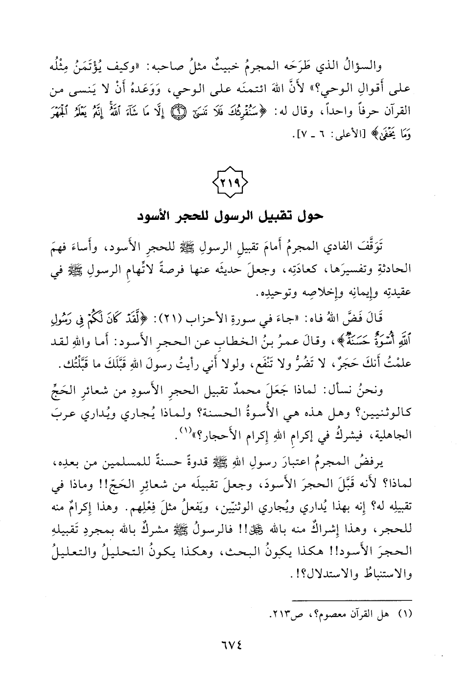 ومستحيل أيضًا أن يكون صلى الله عليه وسلم قد فعل ذلك - أى تقبيل الحجر الأسود - دون وحى أو إلهام وجهه صلى الله عليه وسلم إلى تقبيل الحجر بعيدًا بعيدًا عن أى شبهة وثنية أو مجاراة لعبدة الأصنام.